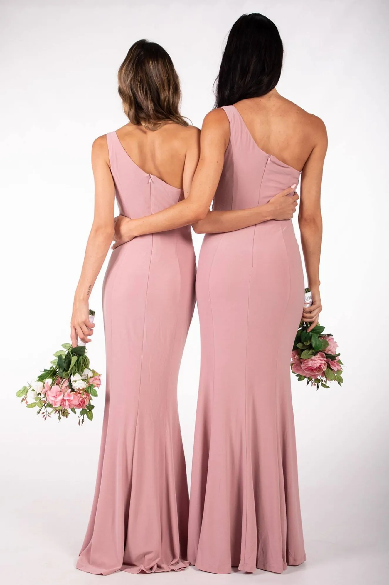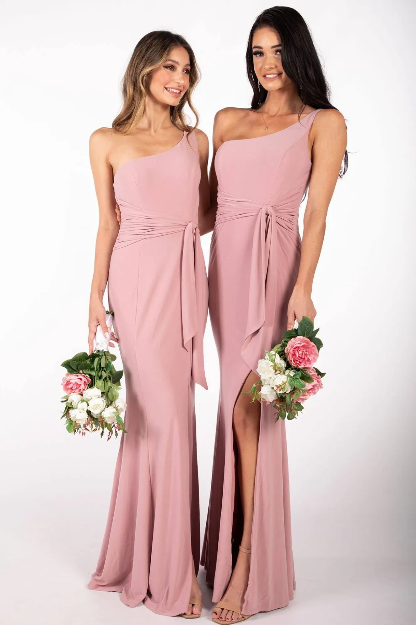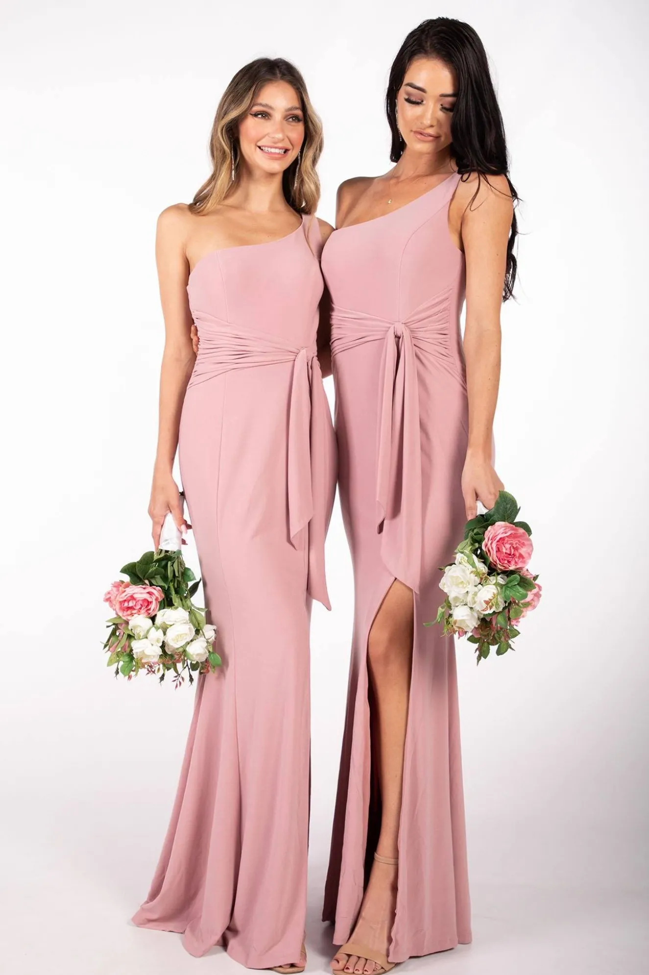ABIGAIL one shoulder maxi dress features asymmetrical neckline, a bodycon fit with waist tie detail, thigh-high slit and a column styled silhouette. This gorgeous one shoulder formal dress is perfect for bridesmaids, wedding guests, red carpets or any special formal occasion.