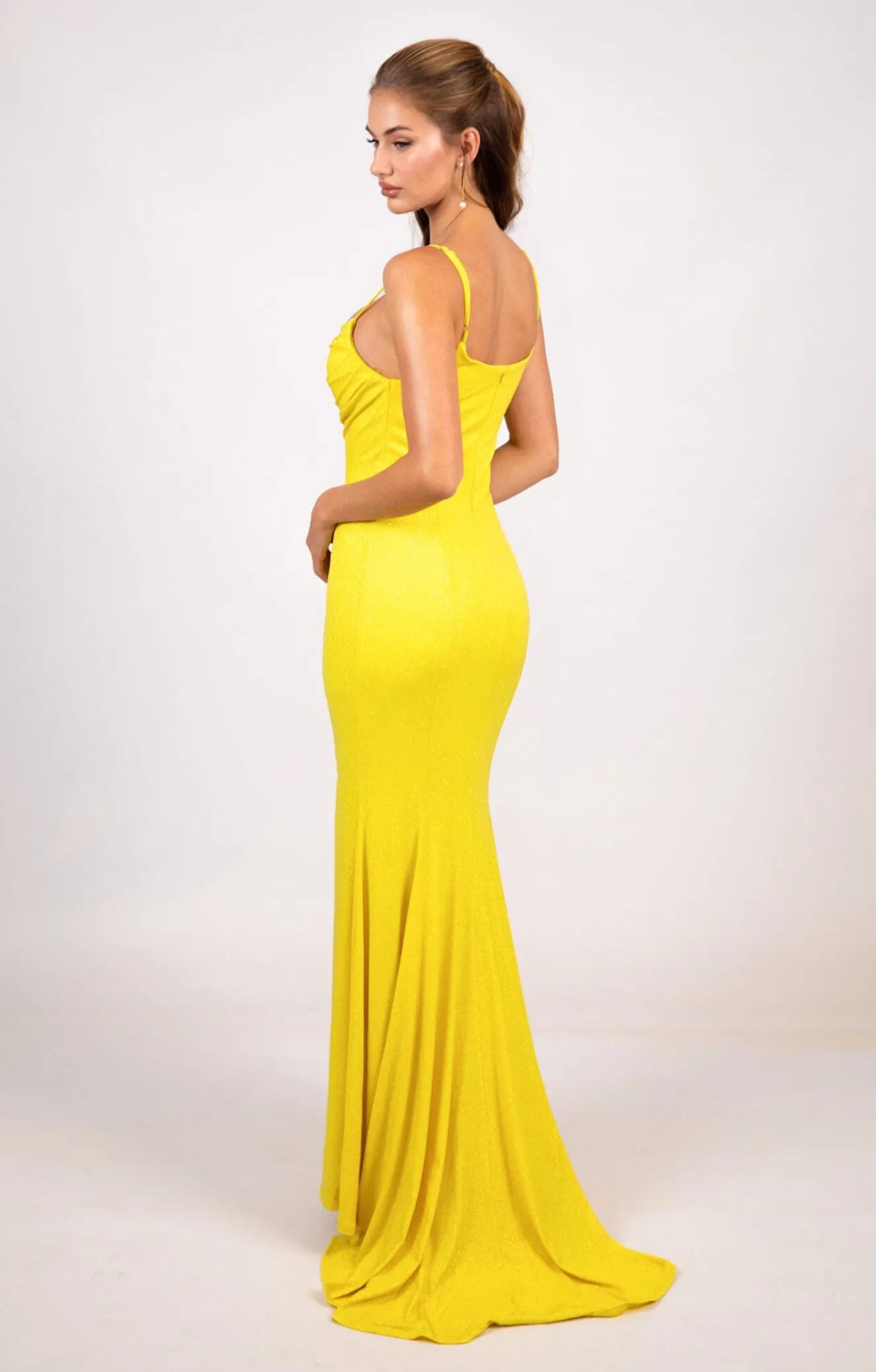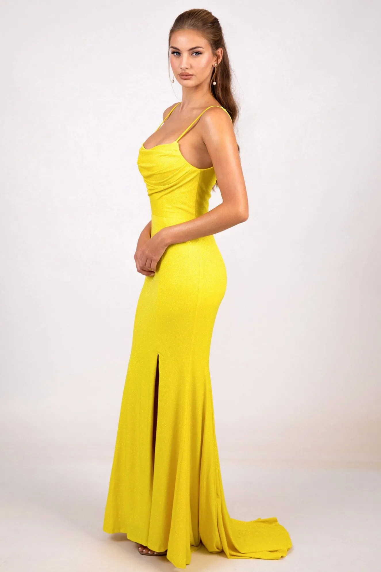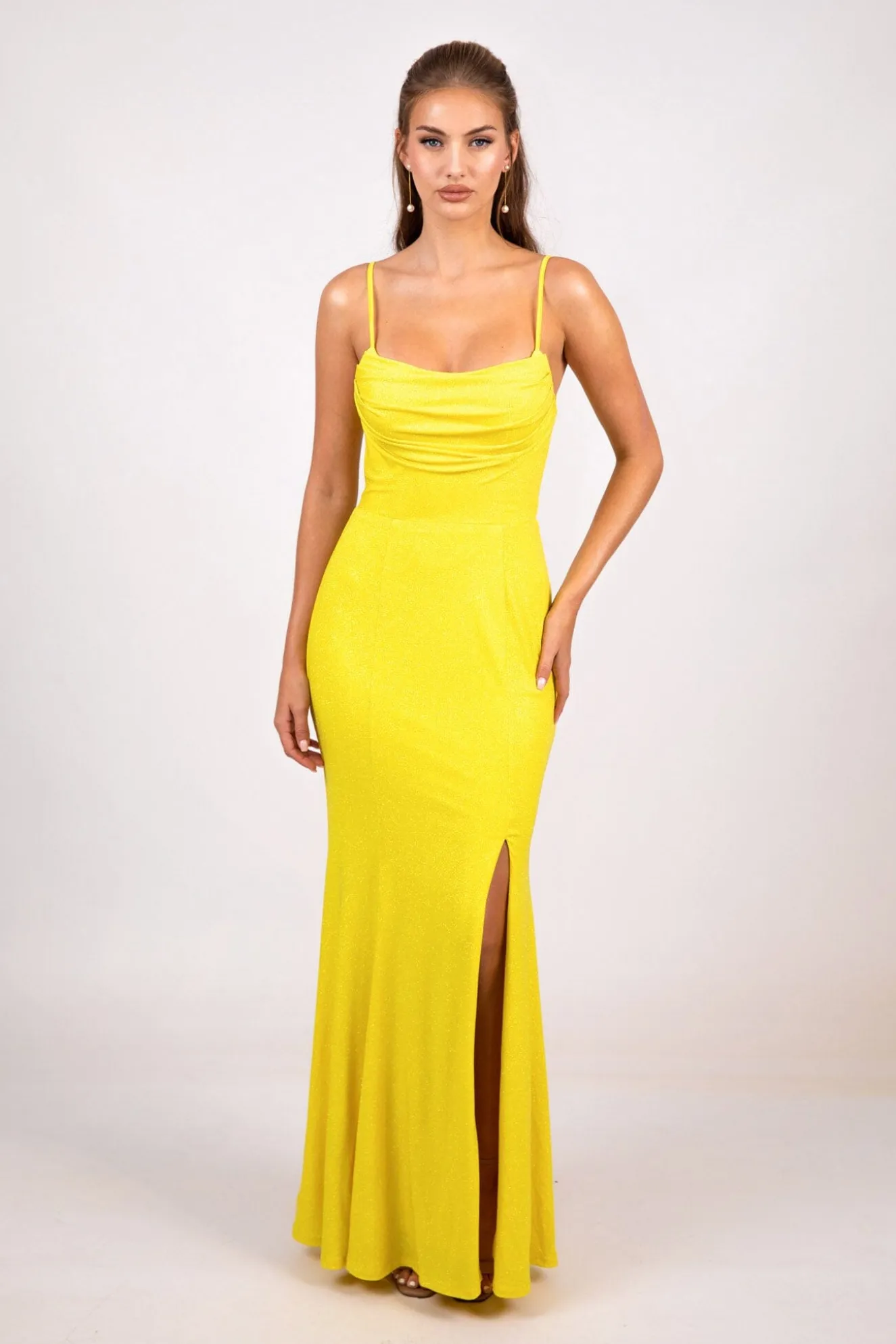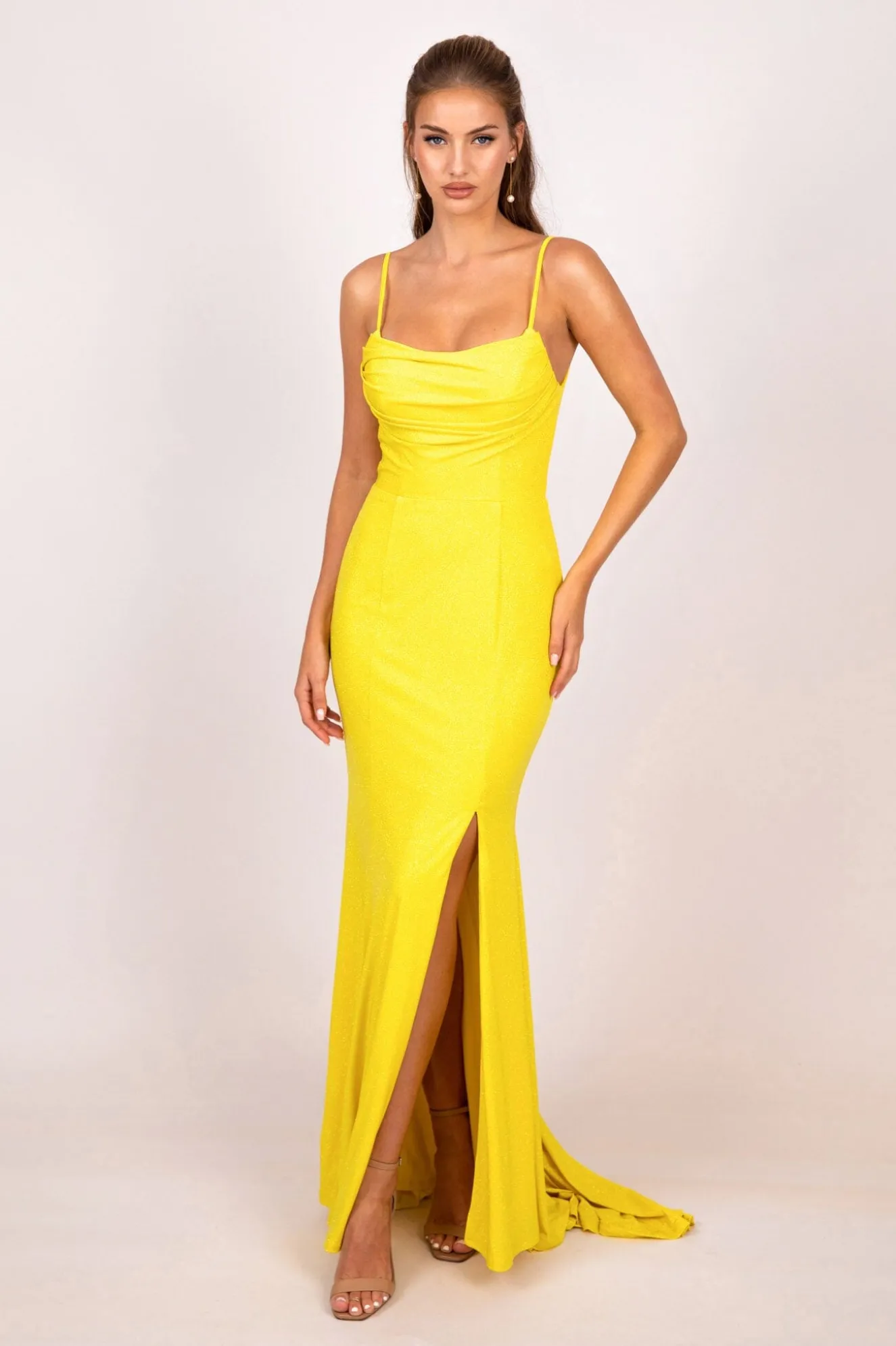 The Angela formal evening dress showcases a sophisticated cowl neckline design with a side split and a moderate train. It features a bodycon fit that accentuates your figure and shimmer fabric that radiates a subtle sparkle. This gorgeous gown is perfect for special occasions as a school formal/prom, wedding guest, a gala, and other red carpet events.