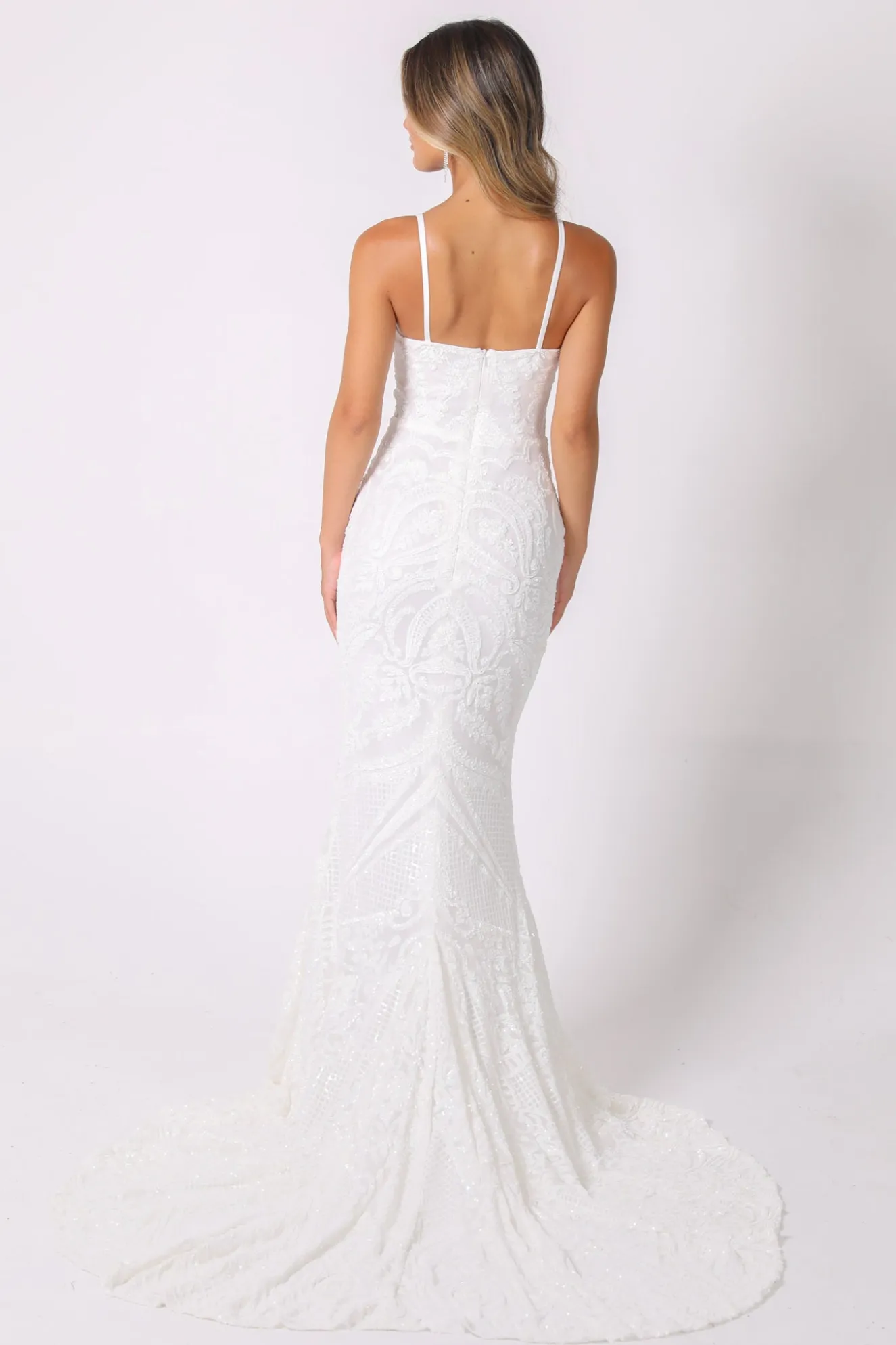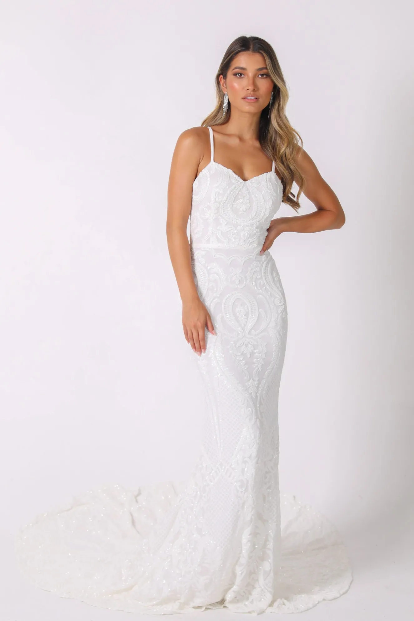 The Gianna gown features white embroidered pattern sequins over white underlay. A classic sweetheart neckline, figure-hugging bodice that flows into a mermaid sweep train create striking silhouette. This dress will make you look and feel beautiful on your wedding day or formal event.