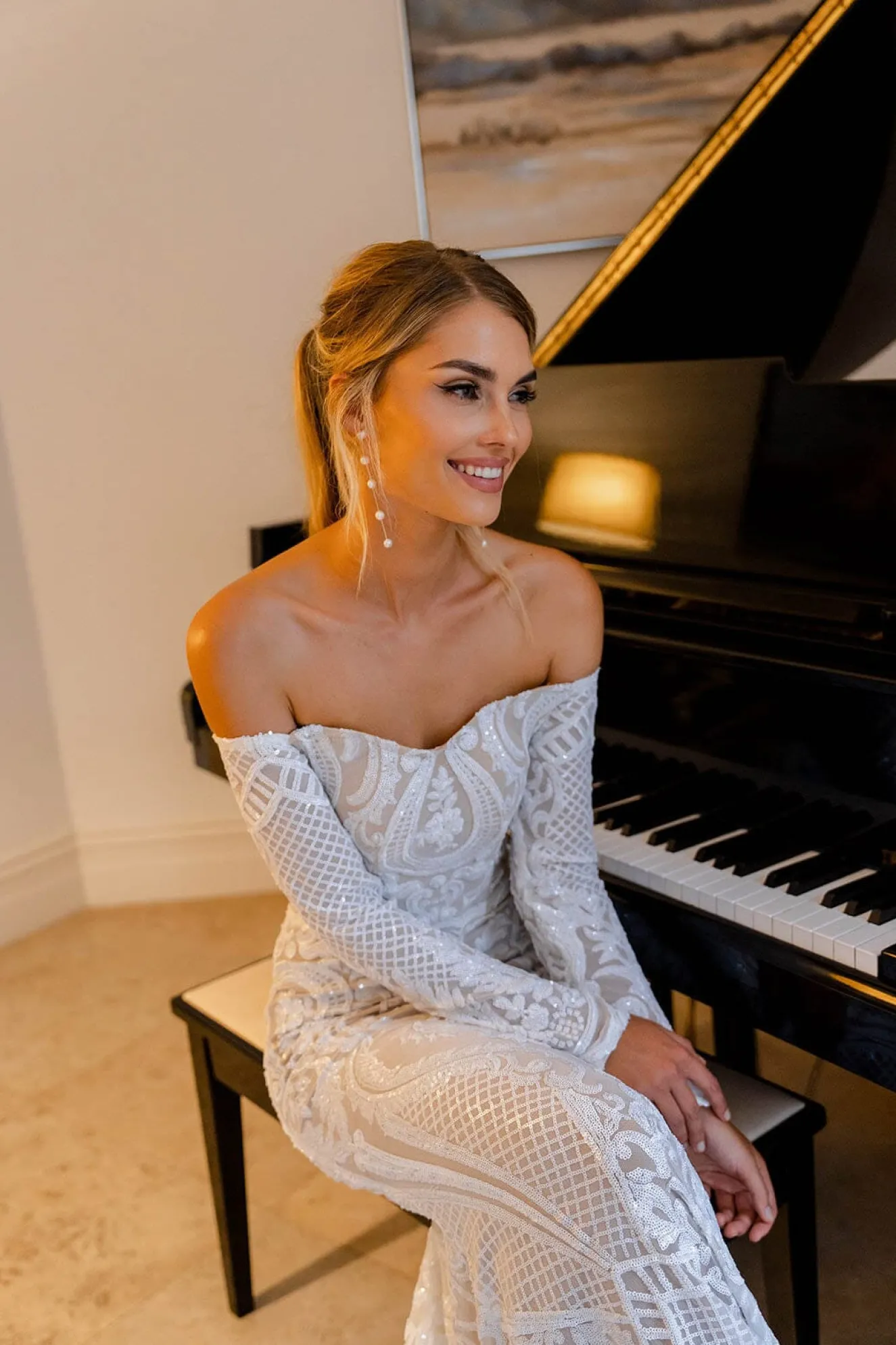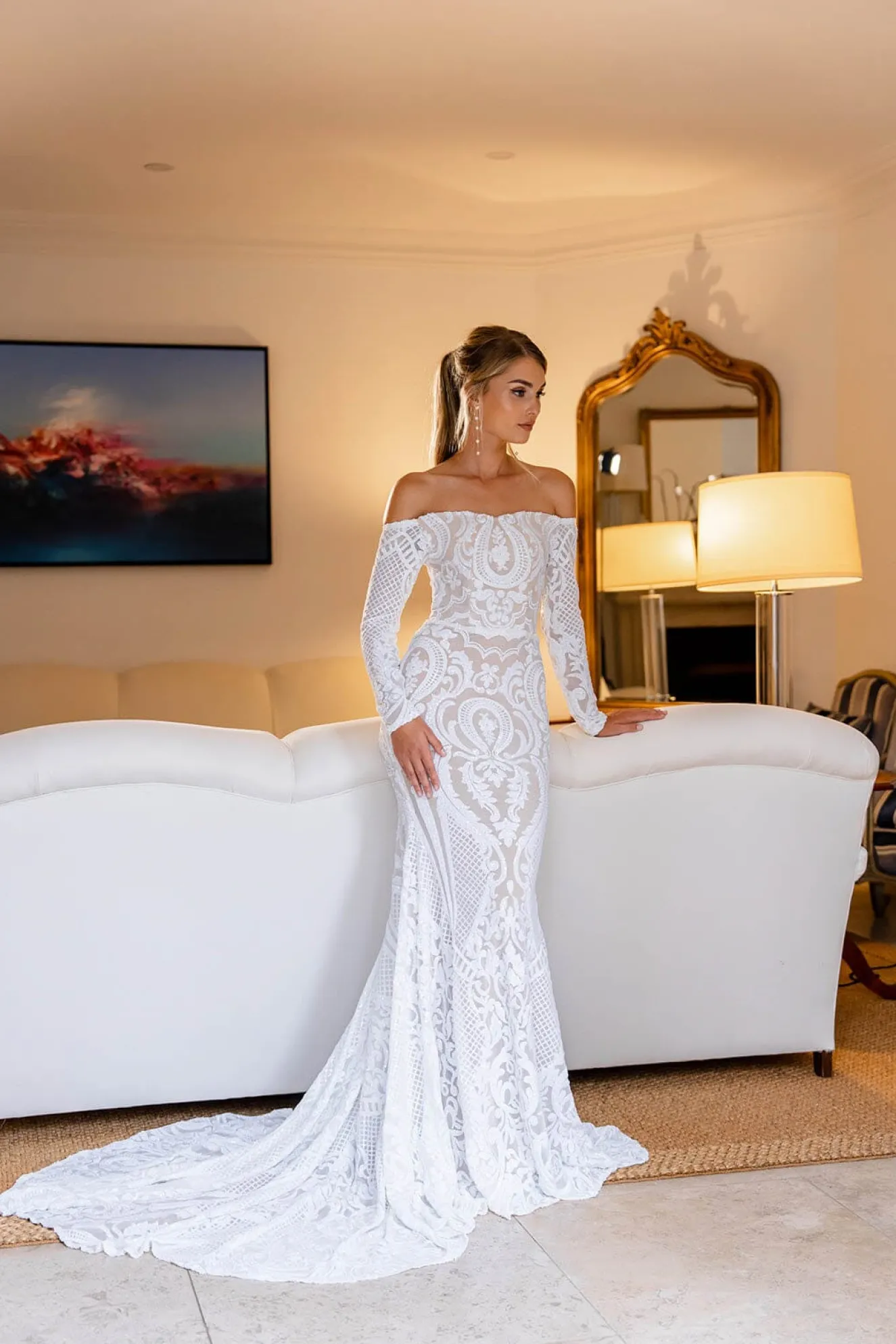GIANNA with off-the-shoulder long sleeves is perfect for a modern bride who wants a classic, minimalist and timeless design. Featuring white embroidered pattern sequins over neutral underlay and striking figure-hugging fit and flare silhouette. This incredibly flattering gown will turn heads walking down the aisle.