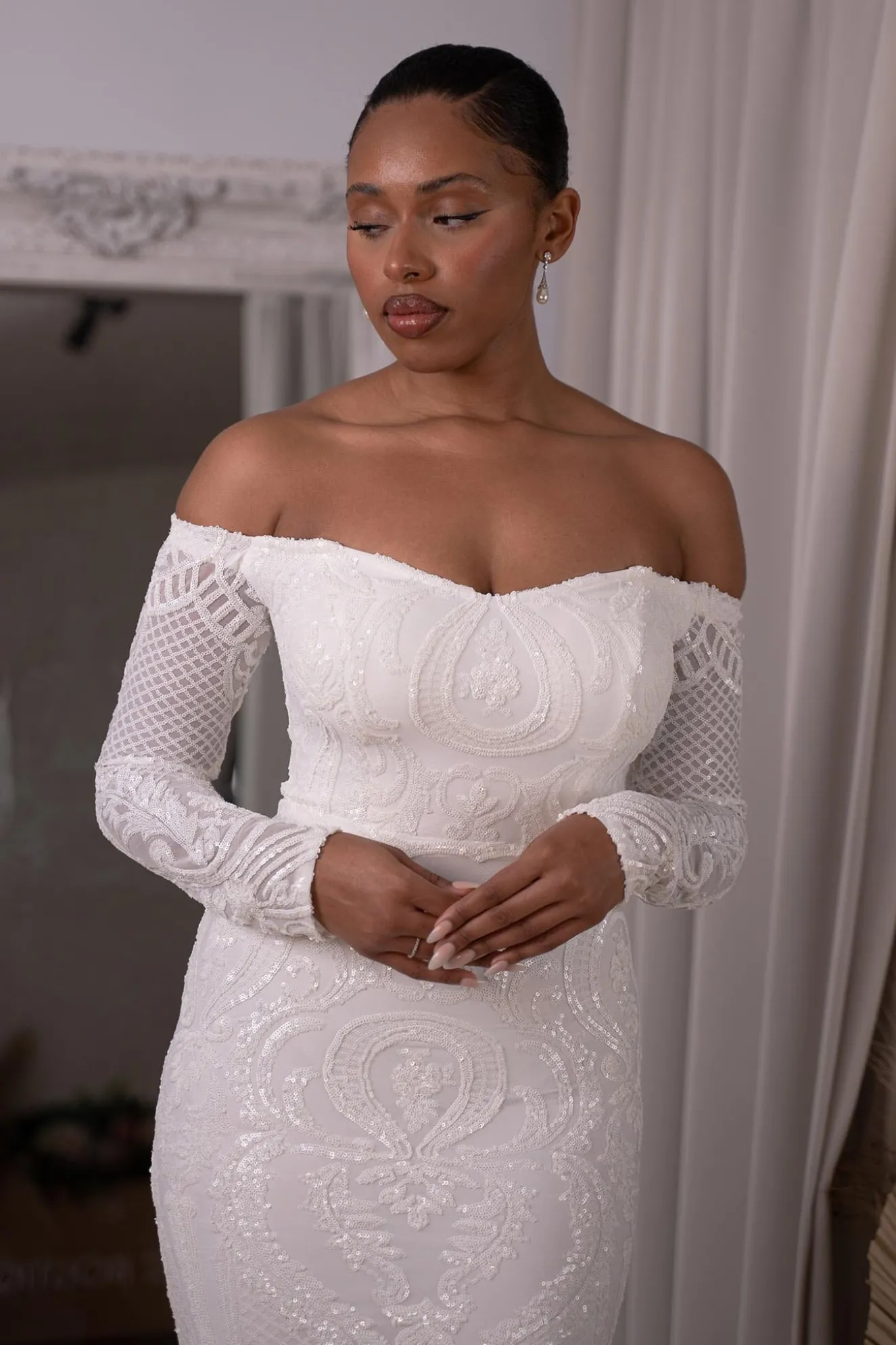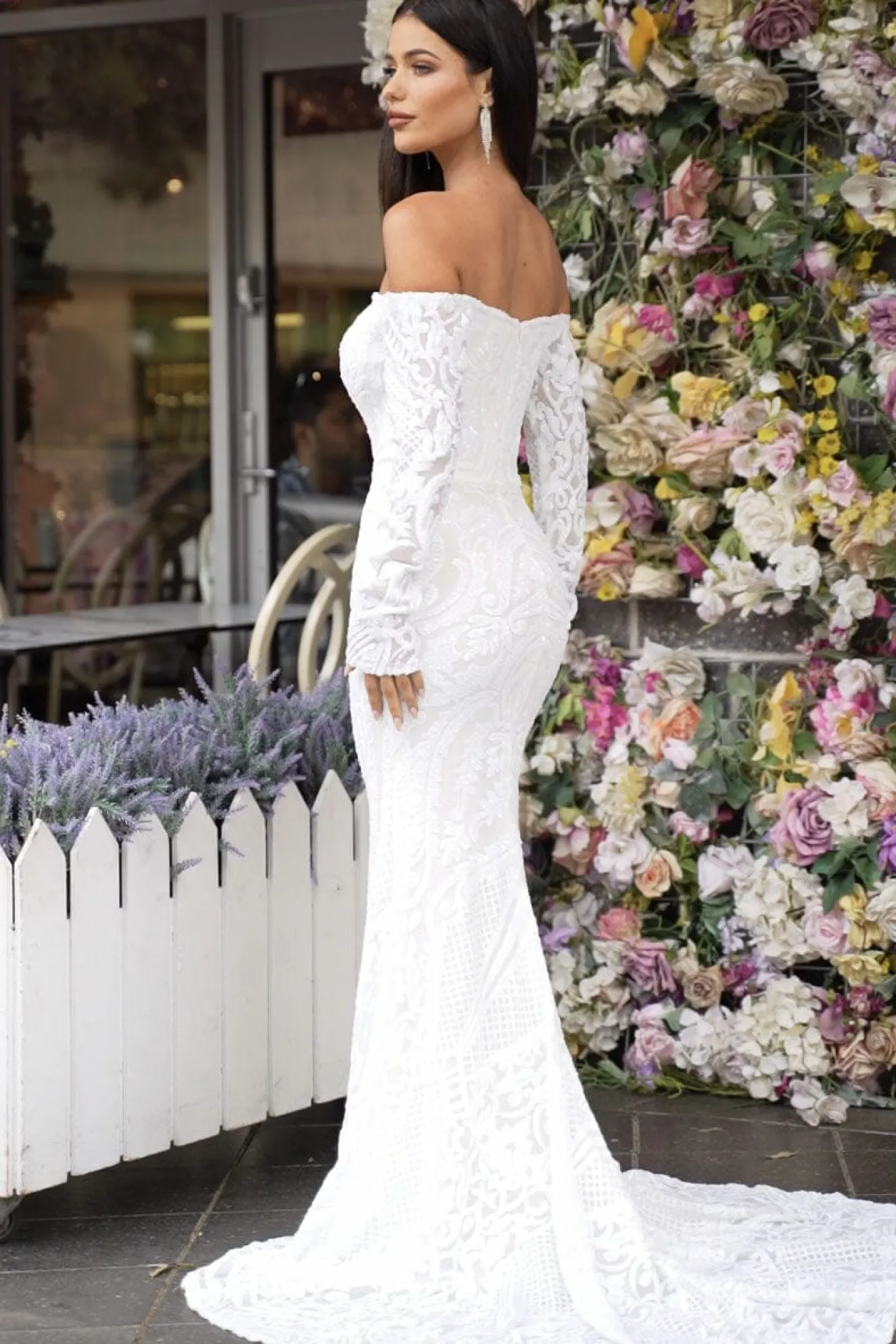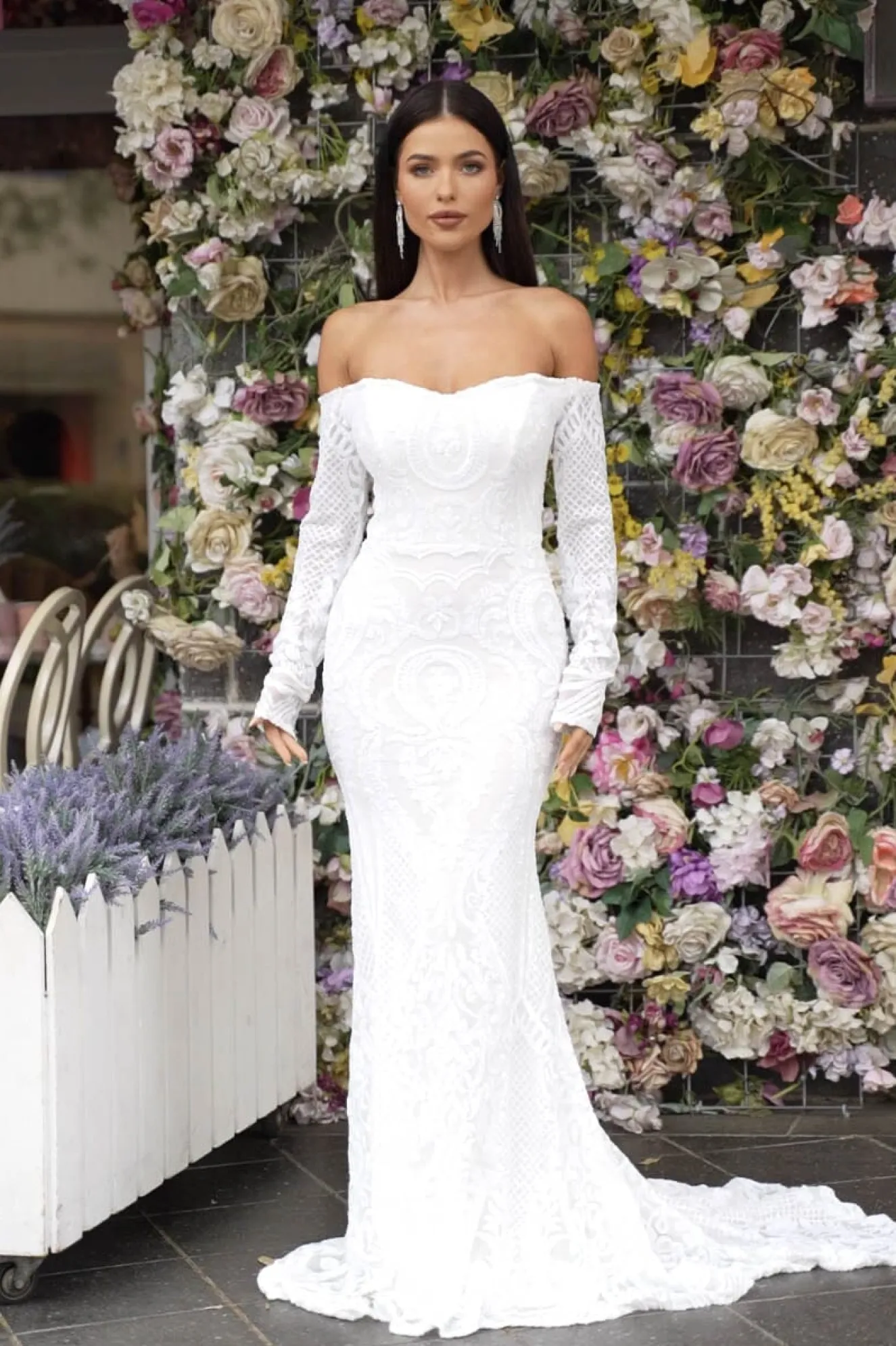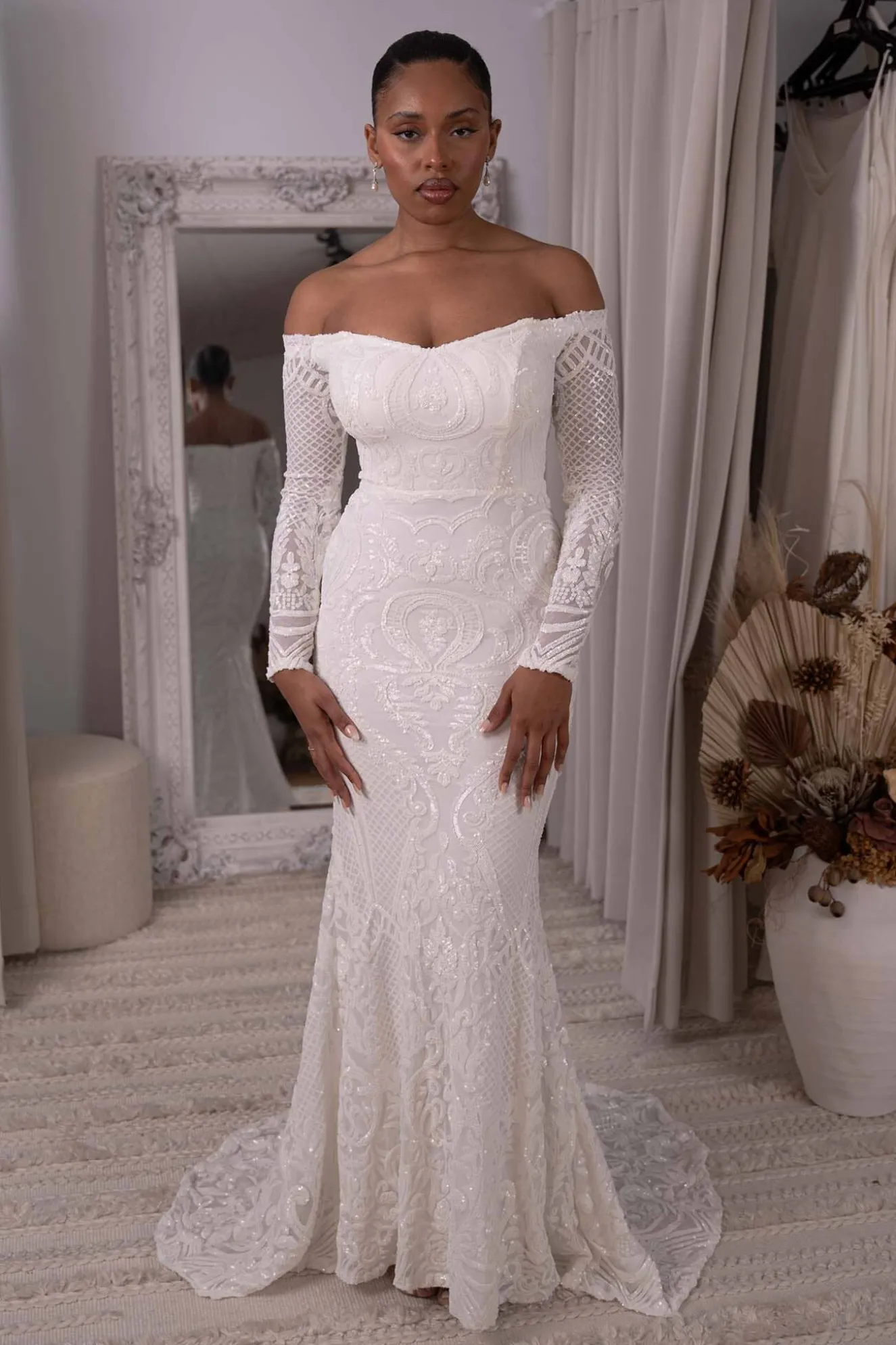 GIANNA with off-the-shoulder long sleeves is perfect for a modern bride who wants a classic, minimalist and timeless design. Featuring white embroidered pattern sequins over white underlay and striking figure-hugging fit and flare silhouette. This incredibly flattering gown will turn heads walking down the aisle or at any formal event.