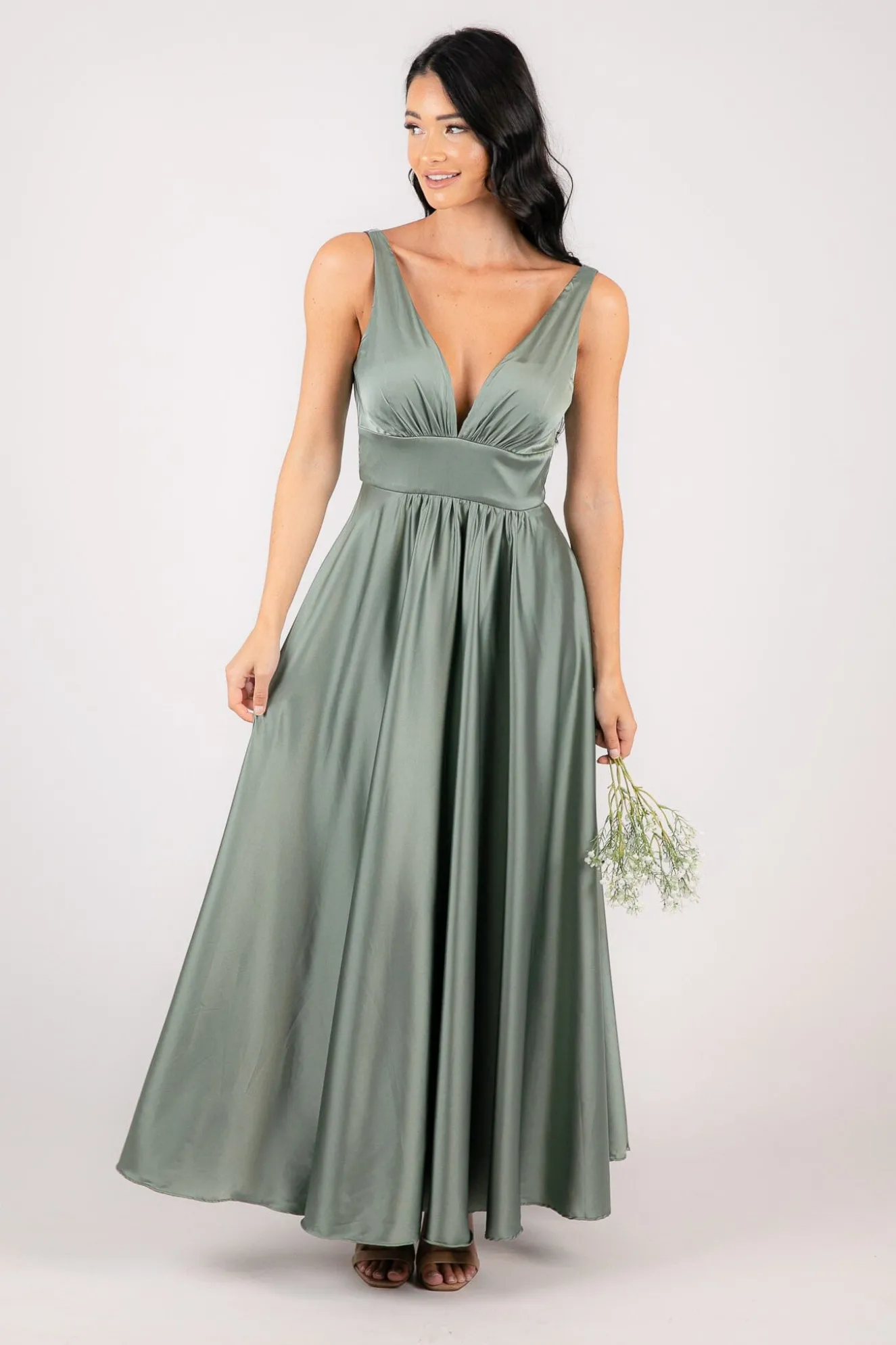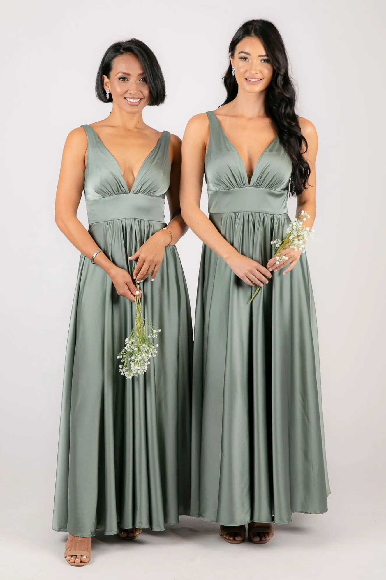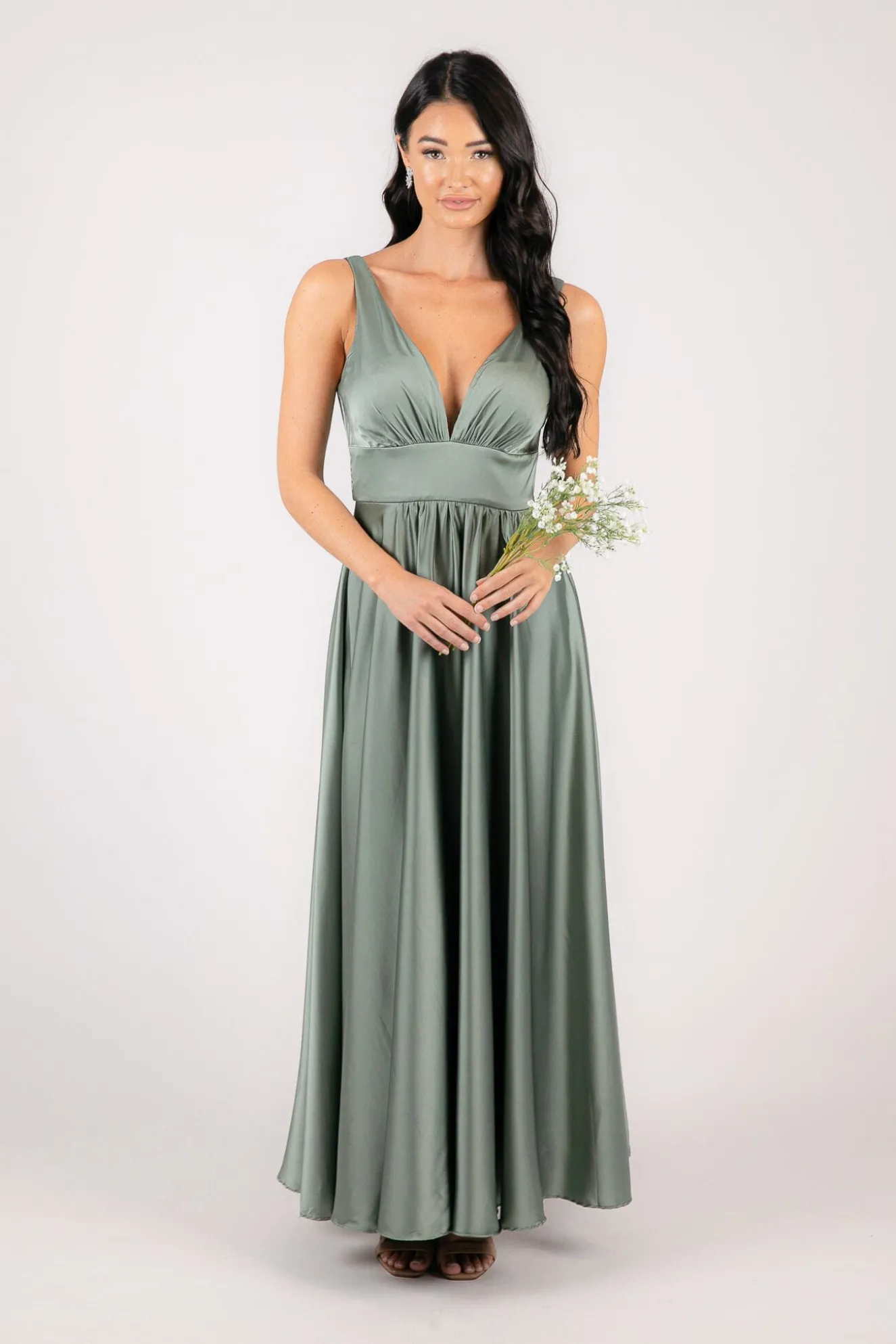 The lovely ISABEL maxi dress is effortlessly chic. Featuring deep V-neckline A-Line silhouette with gathered front detail and crafted from luxurious silky satin fabric. Wear this beauty with soft wavy hair and drop earrings. Perfect as a bridesmaid dress, wedding guest dress, school formal and other special occasions.