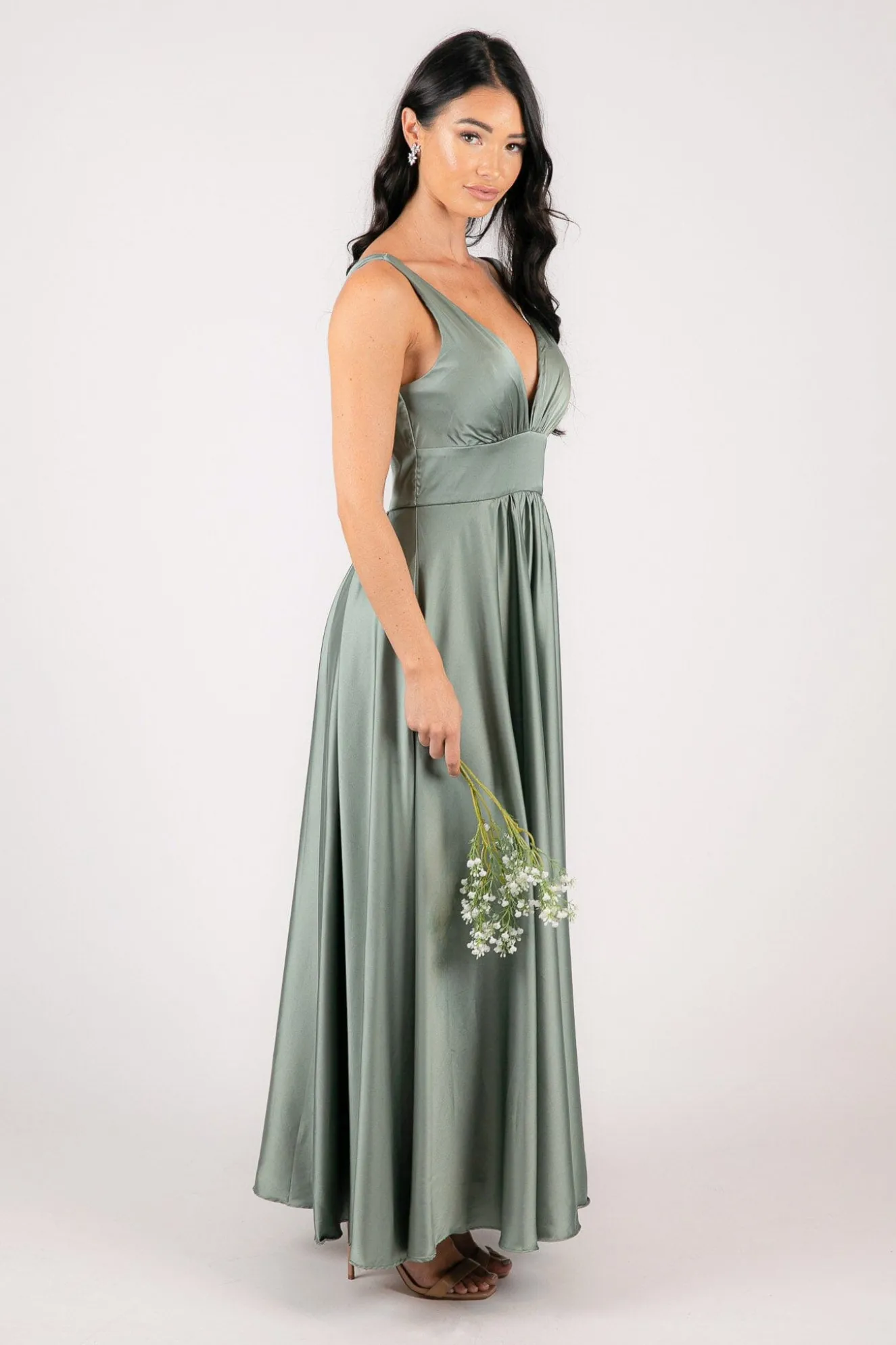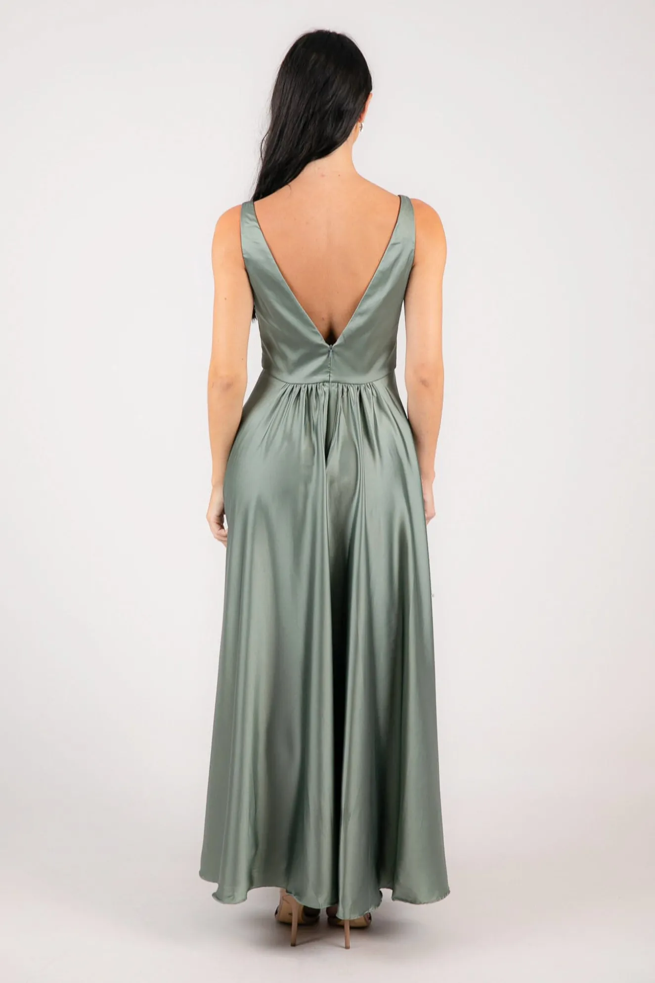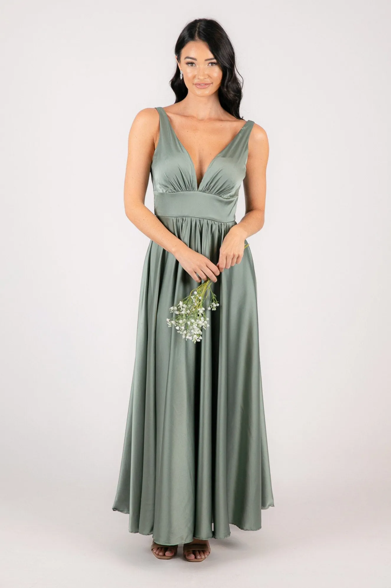 The lovely ISABEL maxi dress is effortlessly chic. Featuring deep V-neckline A-Line silhouette with gathered front detail and crafted from luxurious silky satin fabric. Wear this beauty with soft wavy hair and drop earrings. Perfect as a bridesmaid dress, wedding guest dress, school formal and other special occasions.