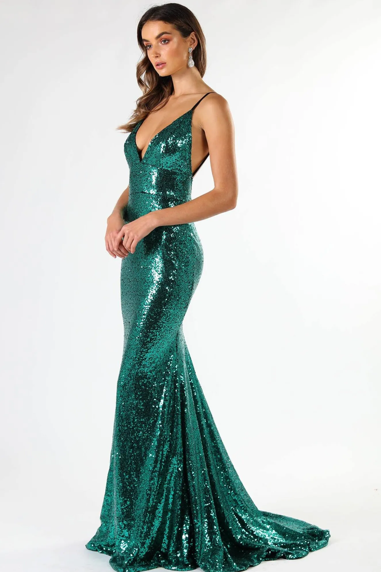 Roselle in Emerald features glistened medium-shade green sequin, plunging V neckline, open back, fit & flare silhouette and dramatic sweep train.