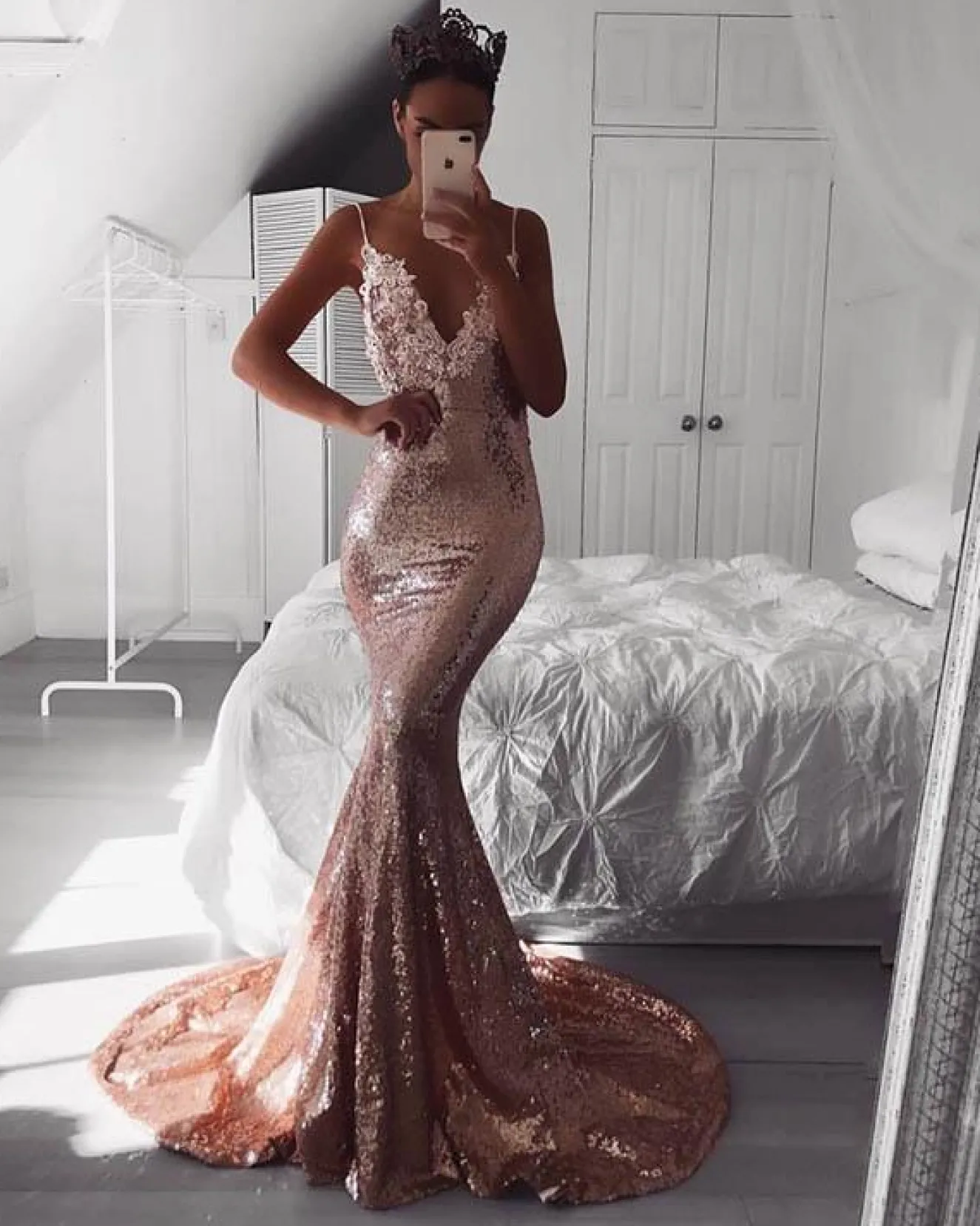 Roselle Luxe in Rose Gold features glistened rose gold sequins with a rosé pink hue, hand beaded lace details, plunging neckline, open back design and dramatic sweep train. Designed in house and exclusive to Noodz Boutique.