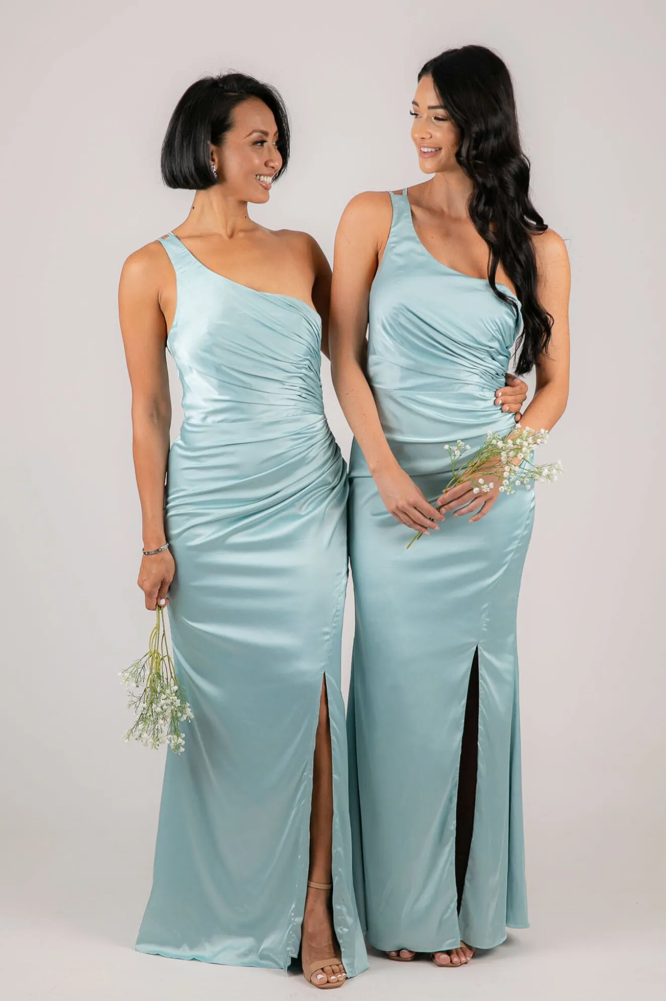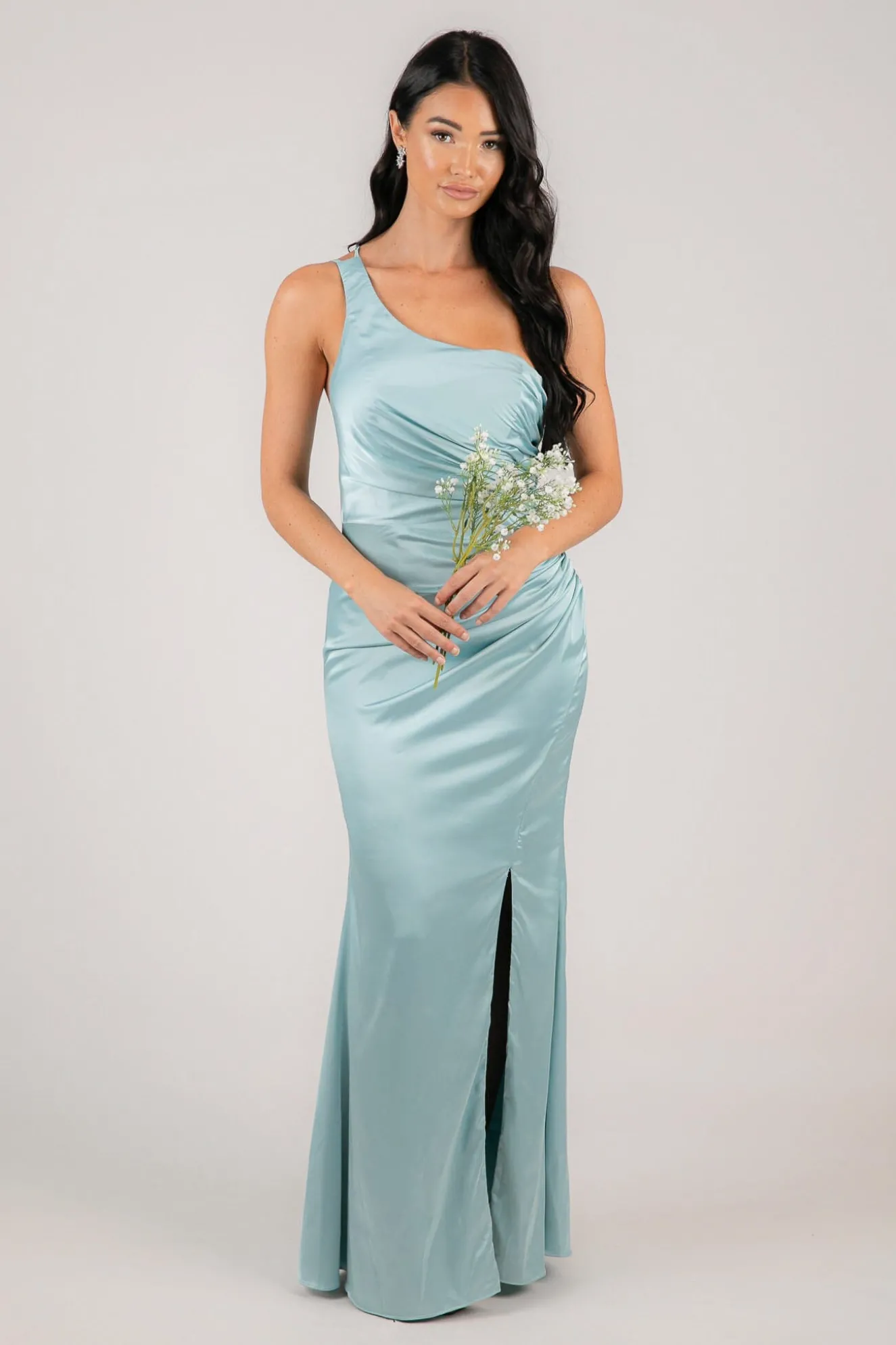 SELENE one shoulder maxi dress features Grecian one-shoulder neckline with ruched waist and thigh-high slit. This gorgeous one shoulder formal dress is perfect for bridesmaids, wedding guests, red carpets and other special occasions.