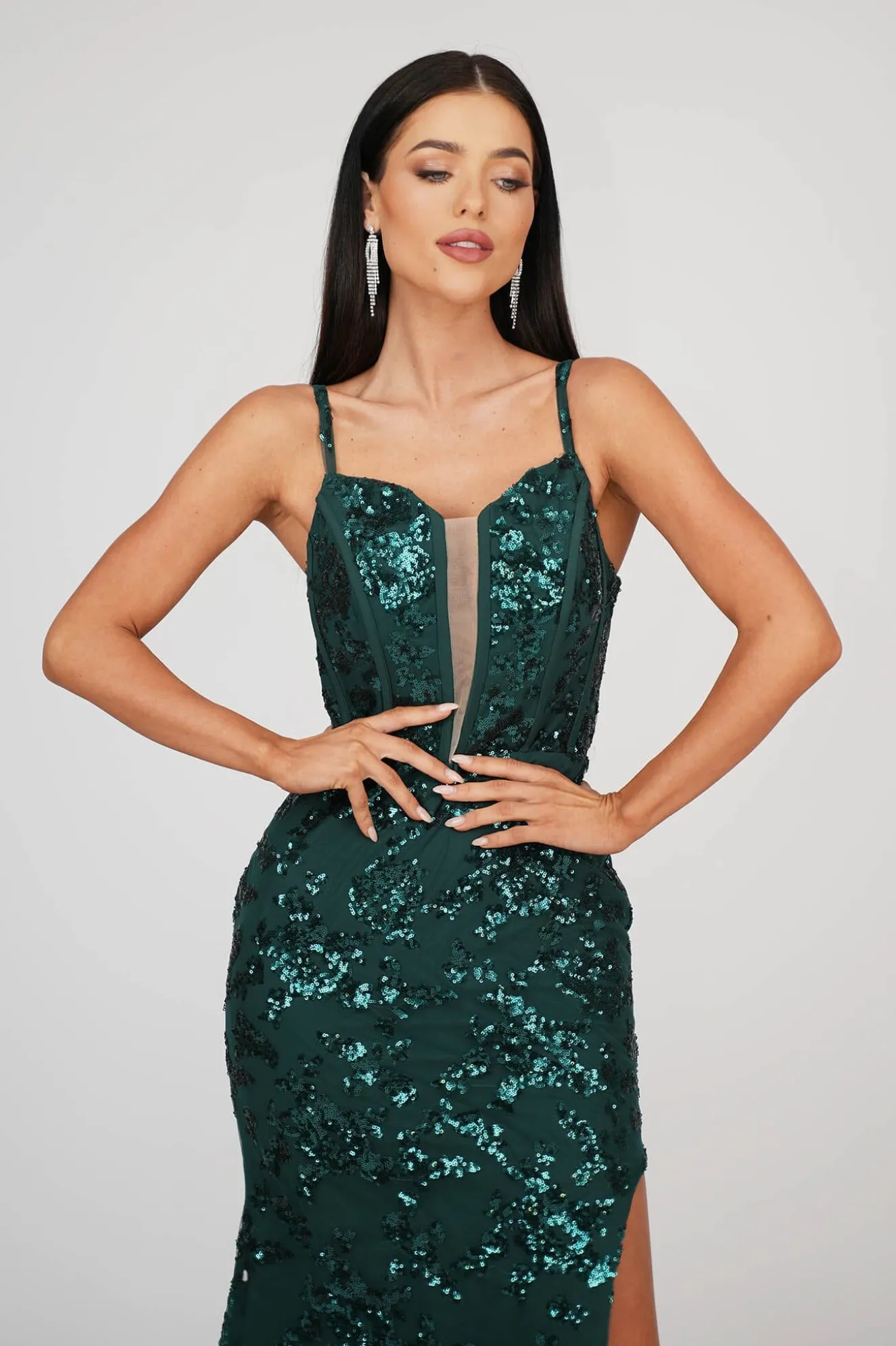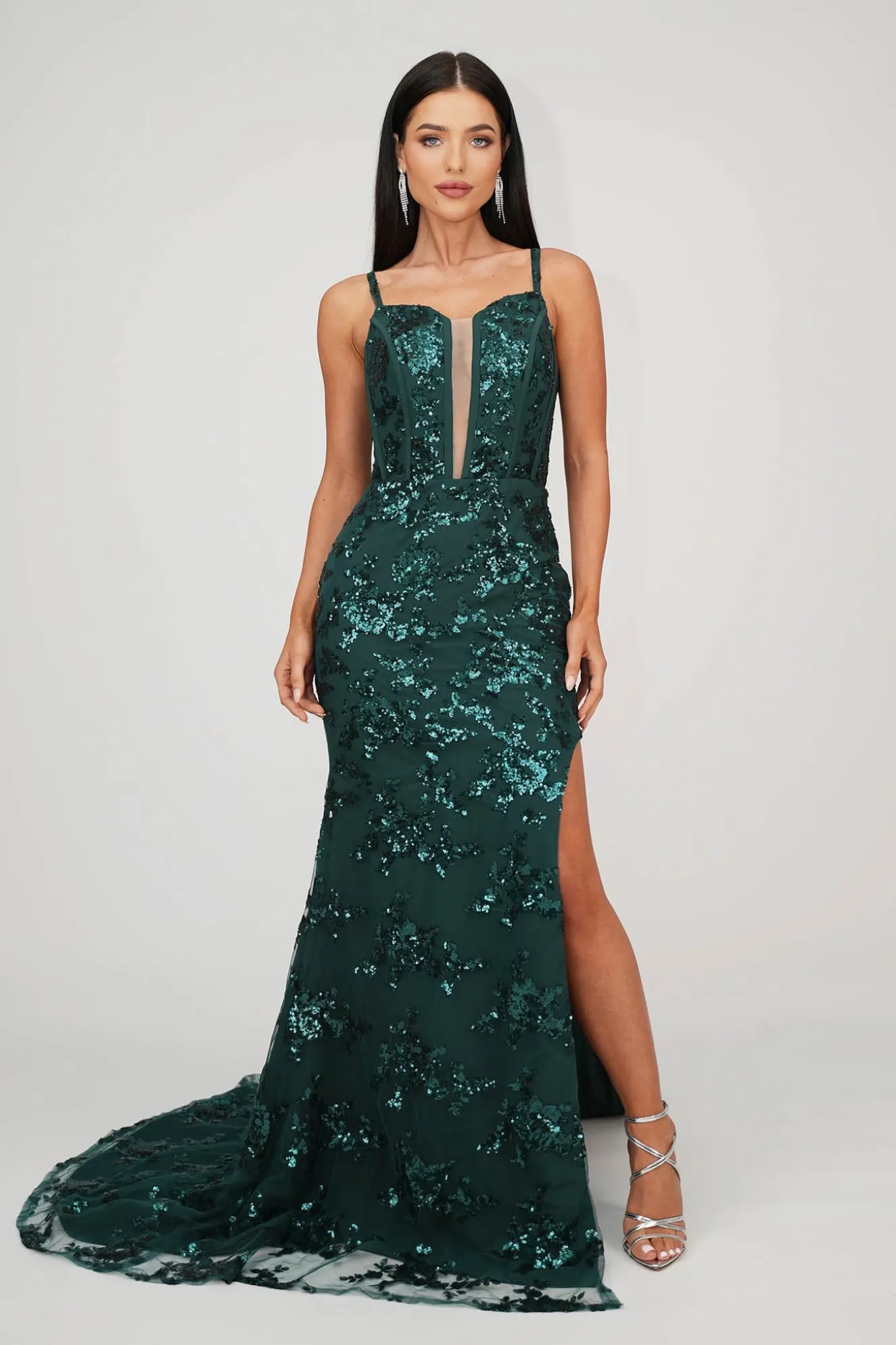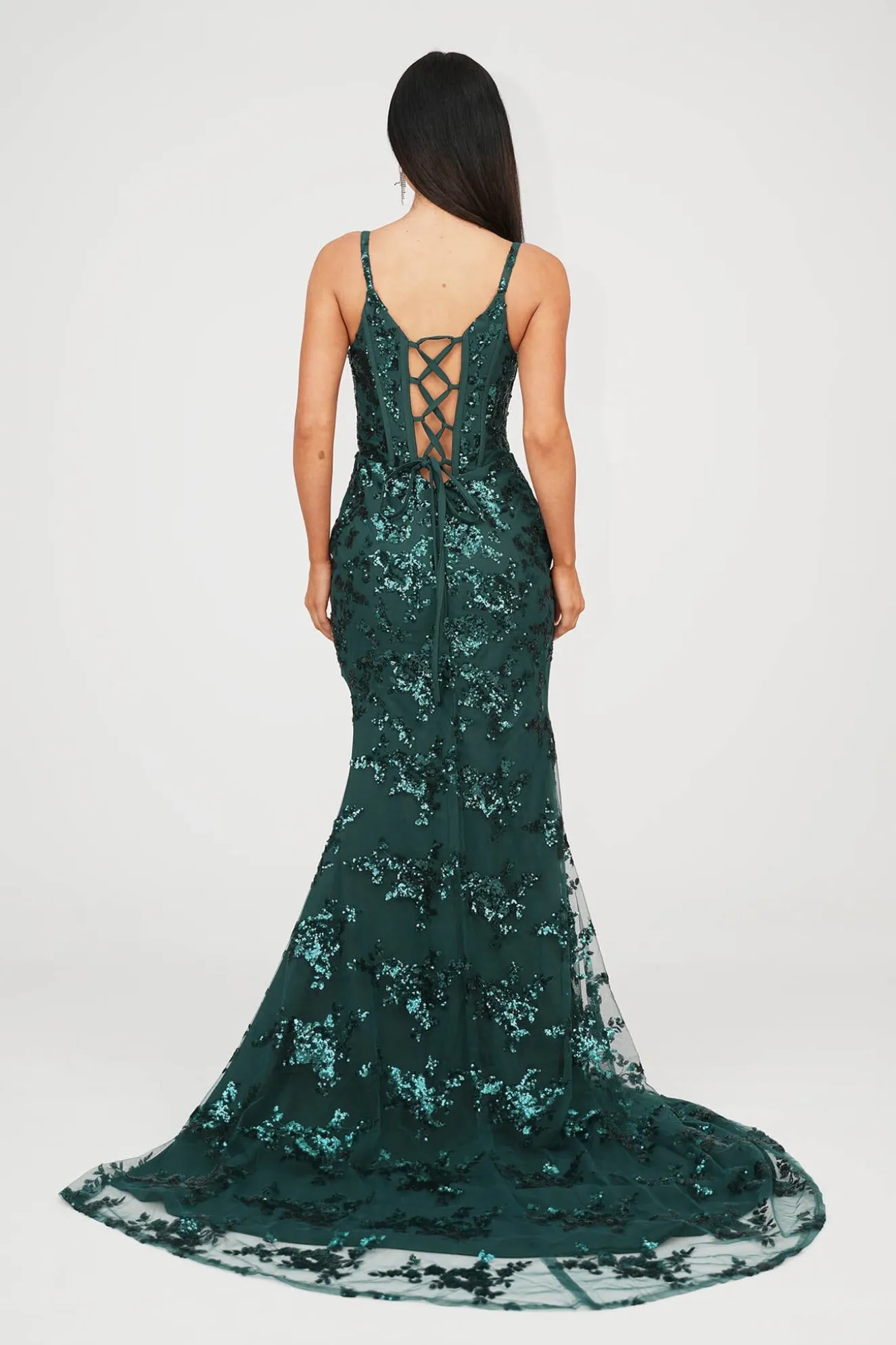 Tatiana is crafted from shimmering floral sequins embellished on mesh material. Featuring trendy corset bodice, high side slit and lace up open back, this gorgeous evening gown will make you look and feel glamorous at prom or school formal, on a red carpet or any formal event.