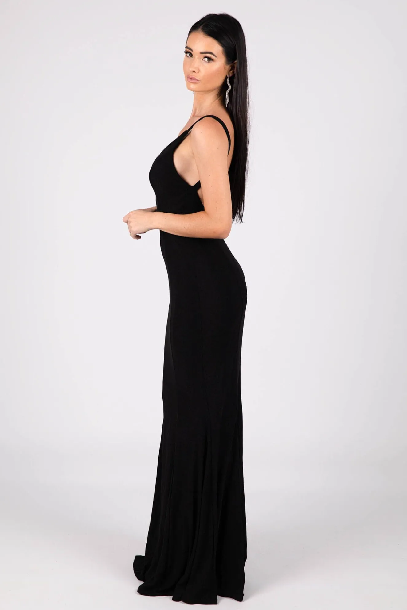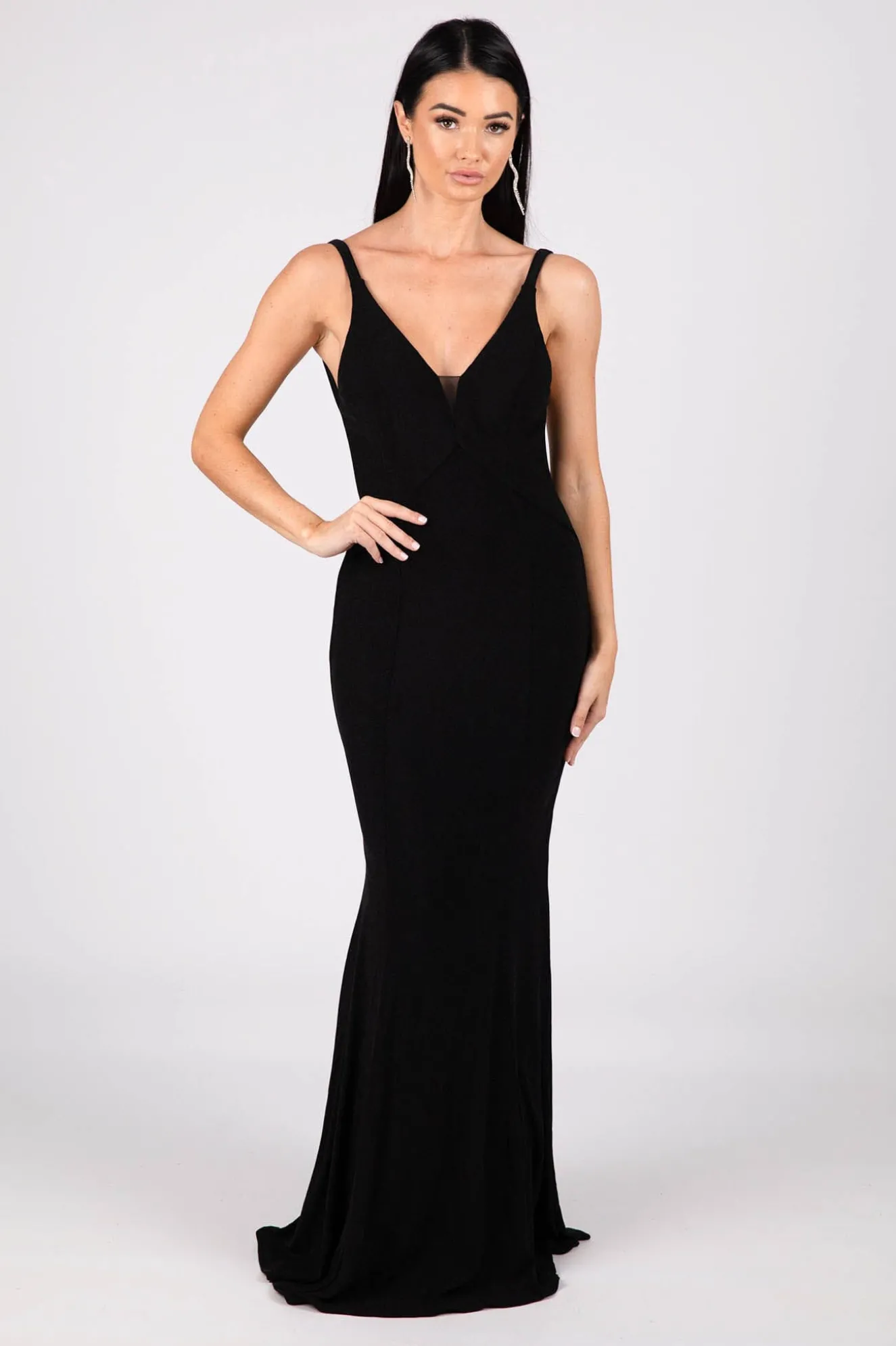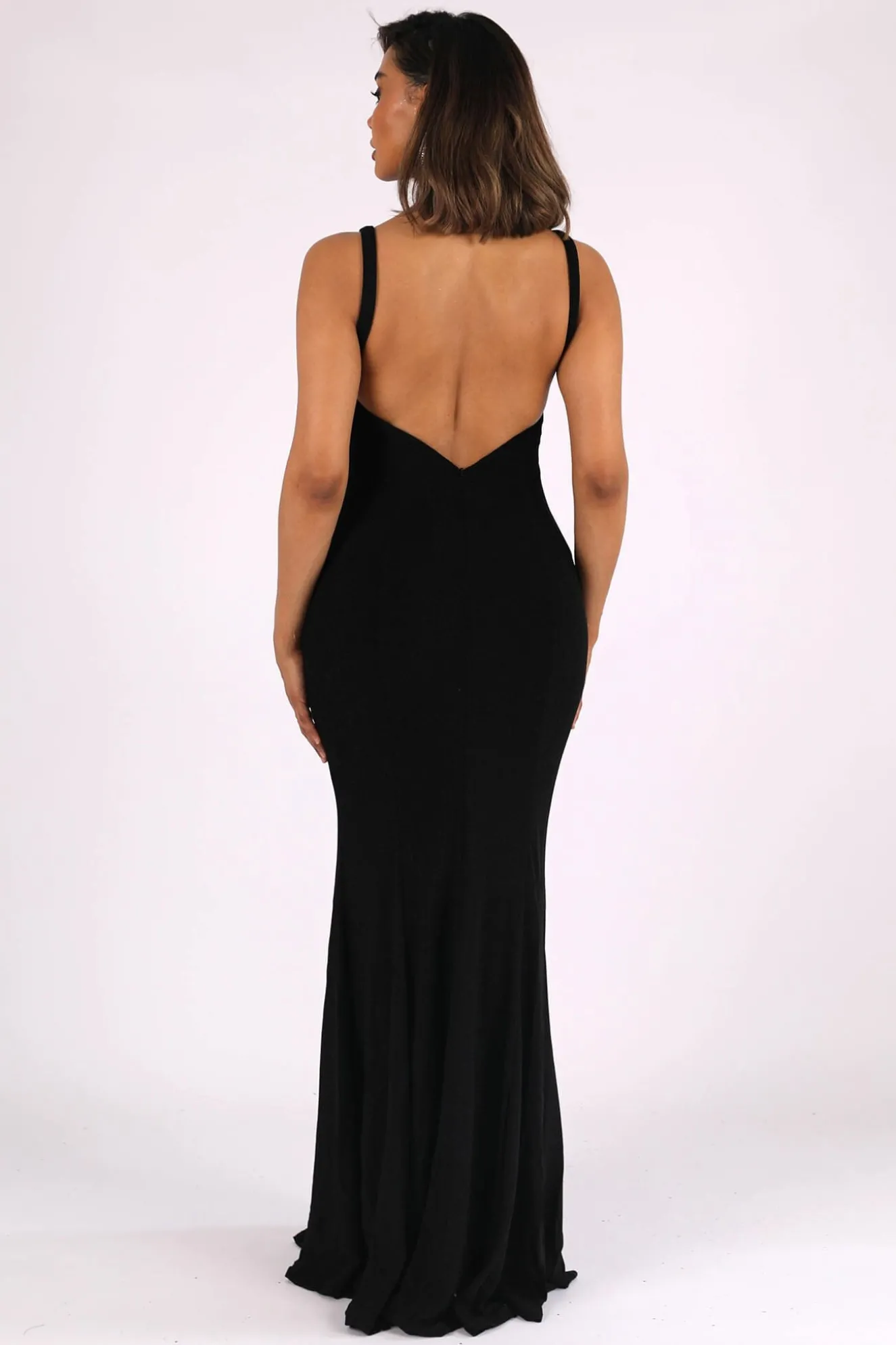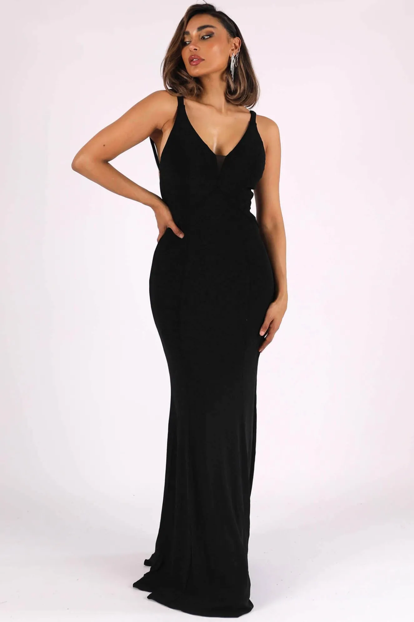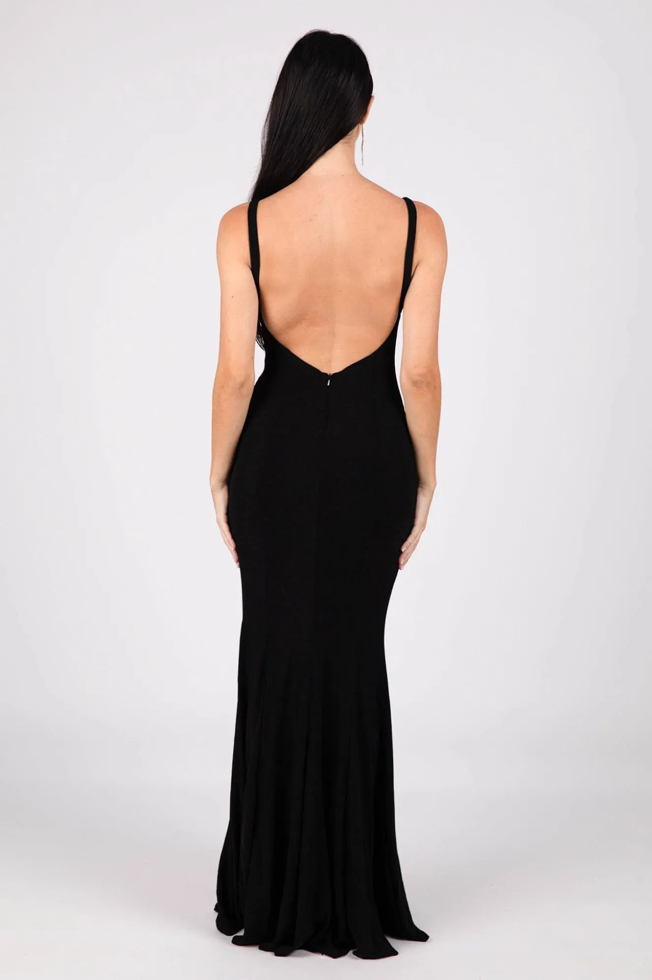 Thalia features classic V plunge neck and open back design. This fitted evening gown is the perfect head turning piece for your next special event.