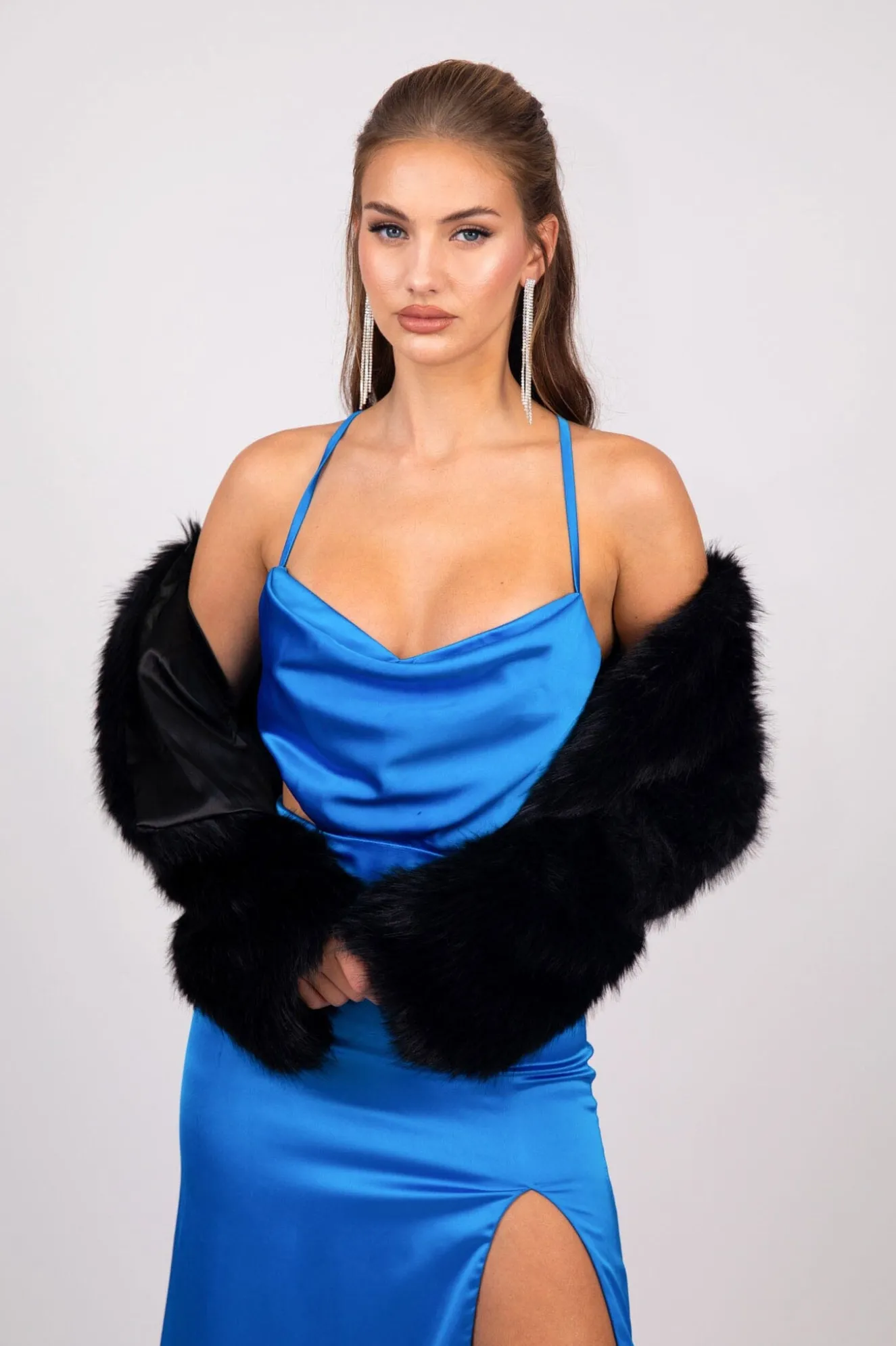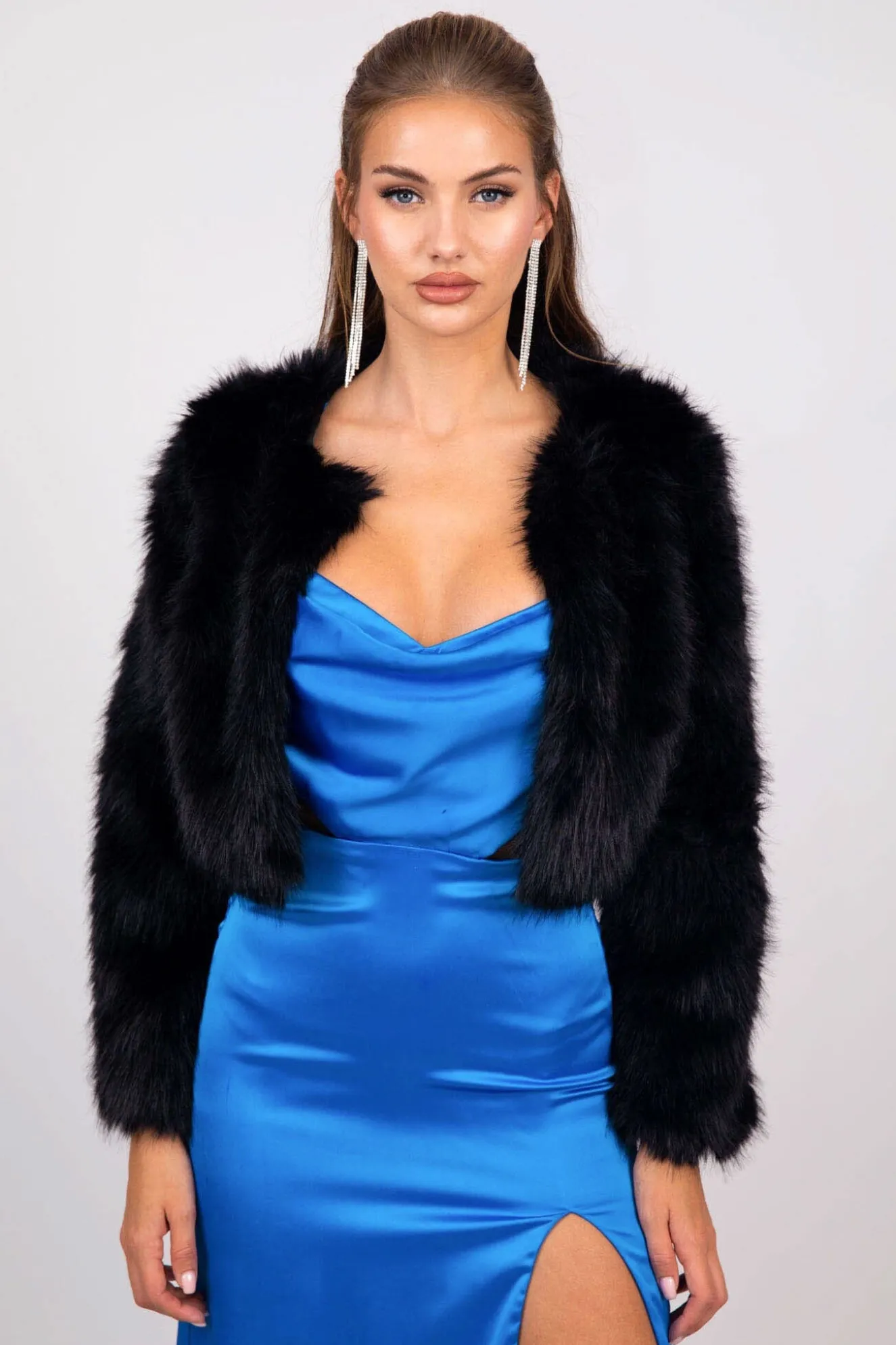 Get winter ready in this sophisticated faux fur jacket. Featuring luxurious faux/artificial fur material that is super soft to touch. Style this black fur jacket over your evening gown to complete the look.
