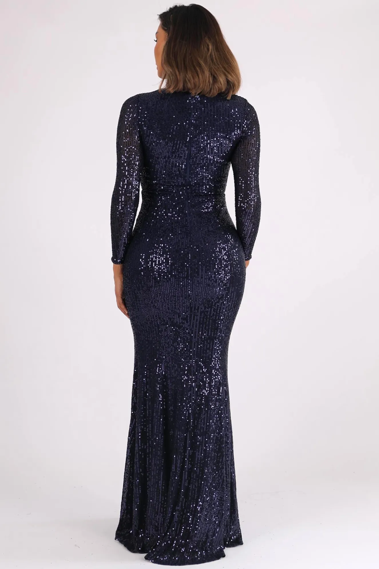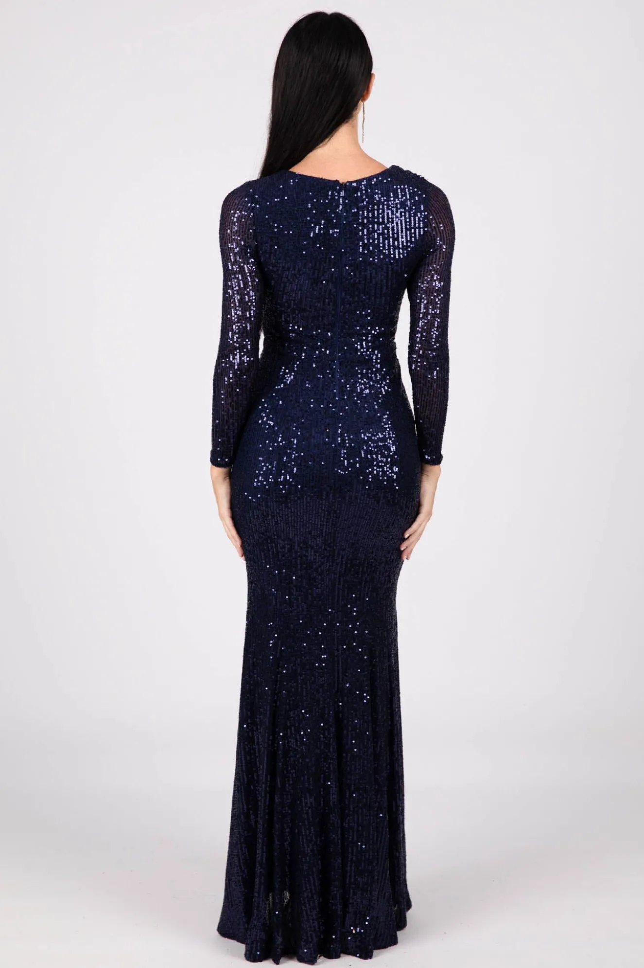 Dionne is a sleek long sleeve evening dress featuring V neckline, front gathered detailing, figure flattering fitted column silhouette with a side split. Made with stretchable sequins that sparkle under the light, this dress will have you feeling effortlessly glamorous on your special day or night.