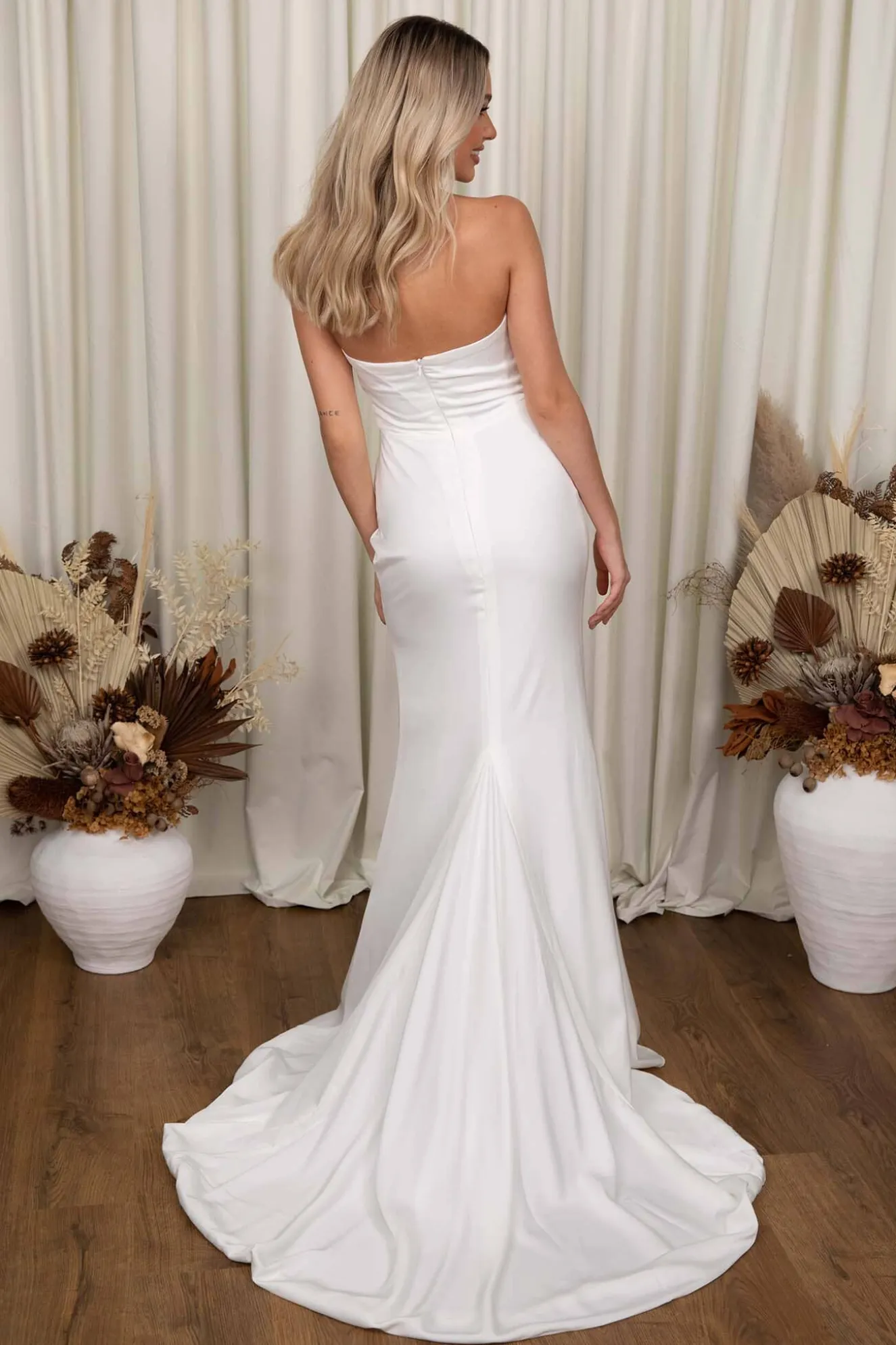 The stunning DOVE satin gown features strapless sweetheart bodice with hidden corset and gathered draping detail. Crafted from the finest, soft silky satin fabric, this gown will make you look and feel glamorous while keeping you comfortable on your big day.