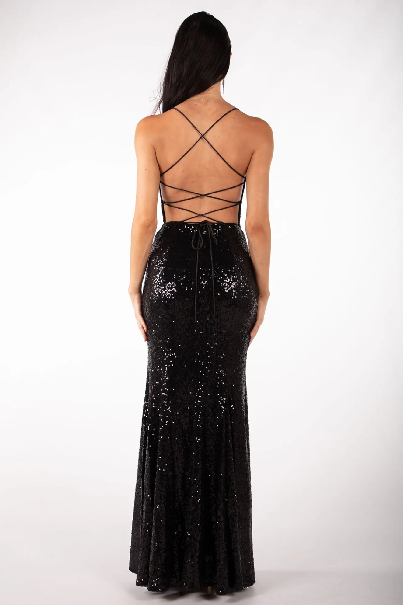 The gorgeous Fresia sequin gown features V neckline with mesh insert, figure flattering fit, above the knee slit and lace up open back design. This sequin maxi dress will stun at any formal event such as prom, gala ball and formal wedding. Style this maxi evening gown with sparky accessories and stiletto heels to complete the look.
