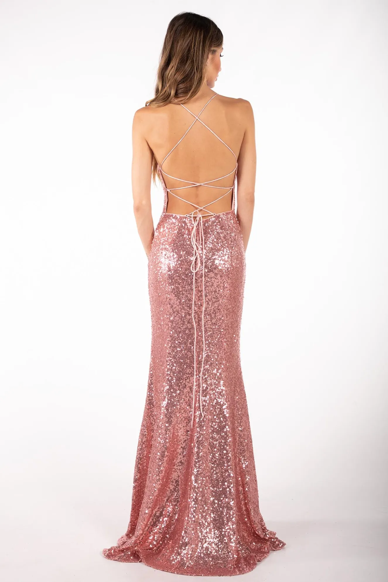 The gorgeous Fresia sequin gown features V neckline with mesh insert, figure flattering fit, above the knee slit and lace up open back design. This sequin maxi dress will stun at any formal event such as prom, gala ball and formal wedding. Style this maxi evening gown with sparky accessories and stiletto heels to complete the look.