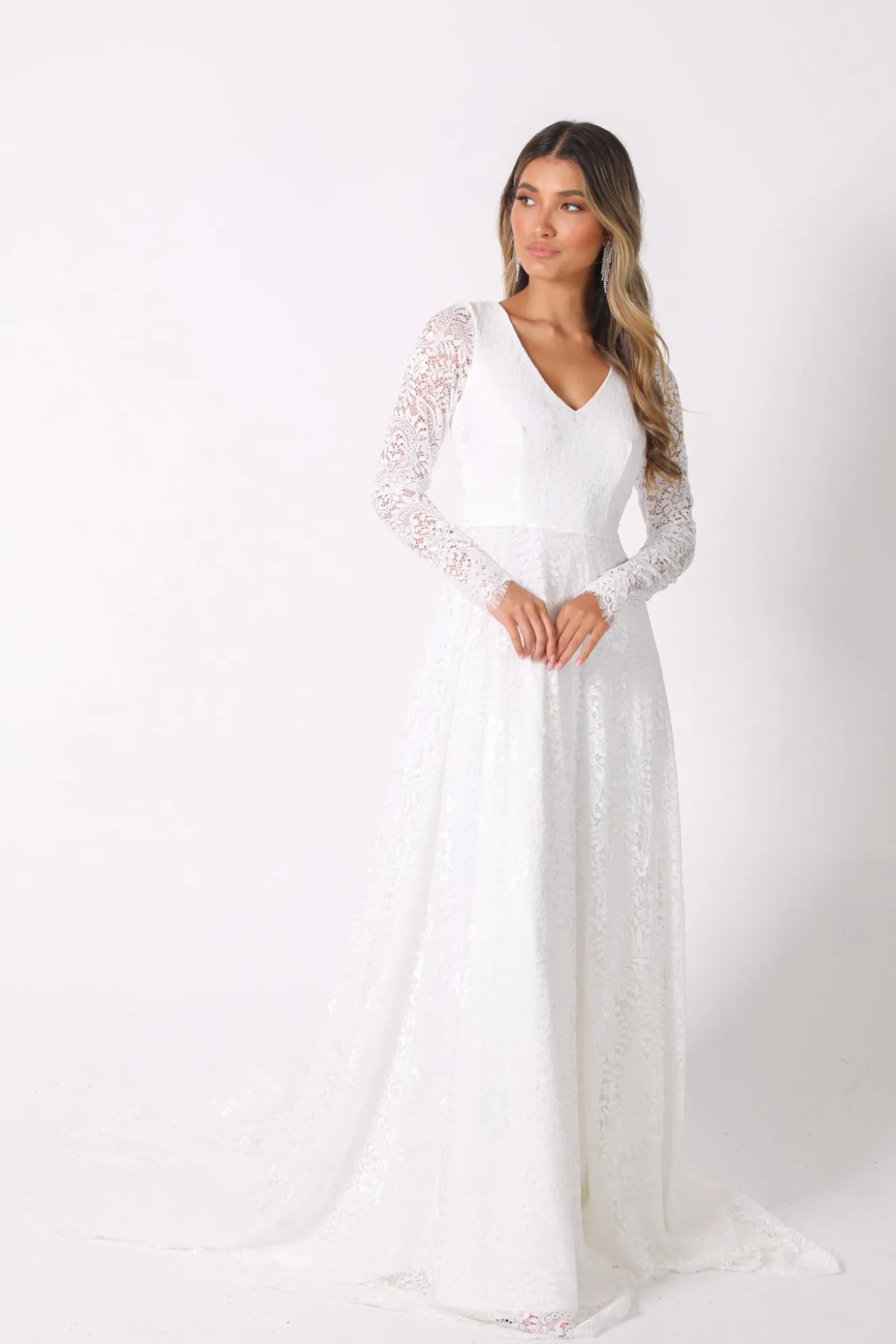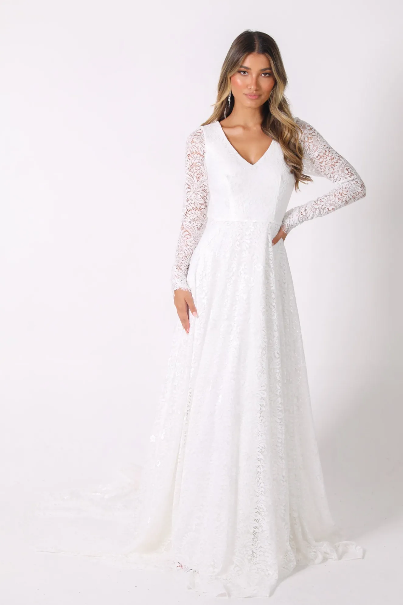 NISHA is perfect for the romantic bride who wants comfort and classic, timeless, chic style. Hand-crafted with a premium stretch lace with a delicate eyelash trim, elegant long sleeves and dramatic A-Line skirt, our NISHA long sleeve wedding dress is made for making memories for years to come.