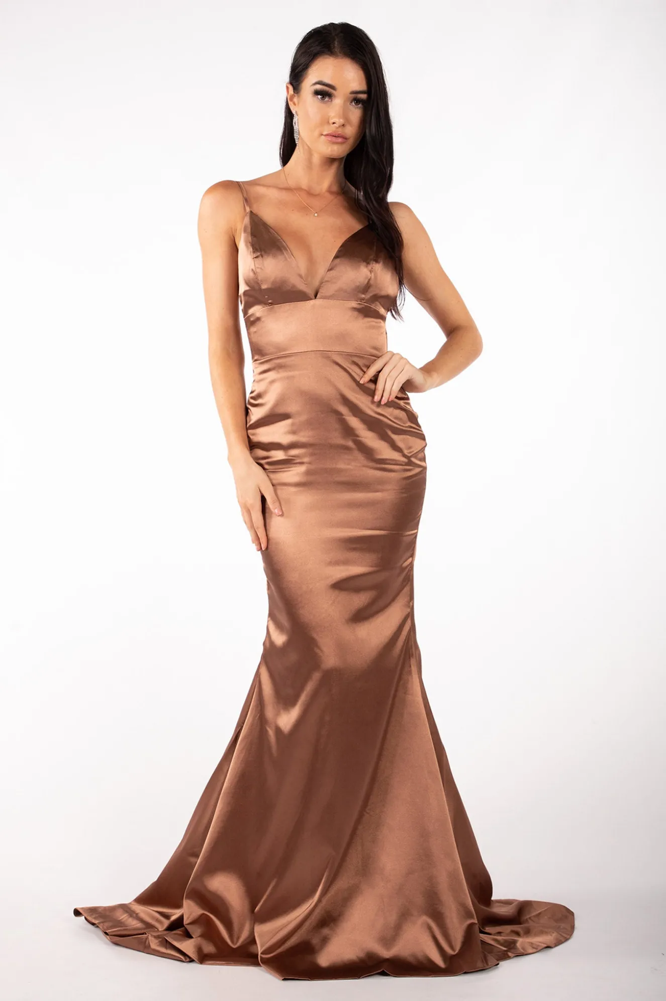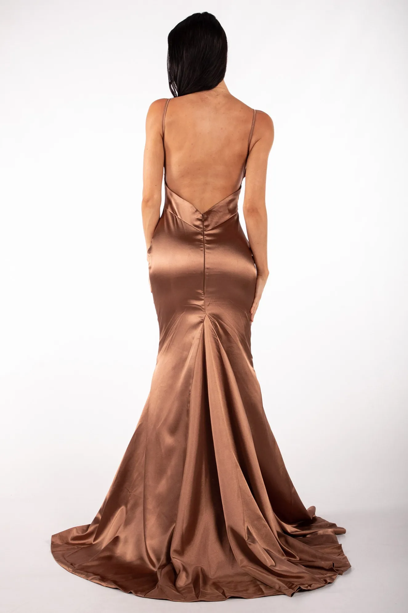 The Penelope satin gown features classic fit & flare silhouette, backless design and a train. Style with sparkly accessories and clutch to complete the look.