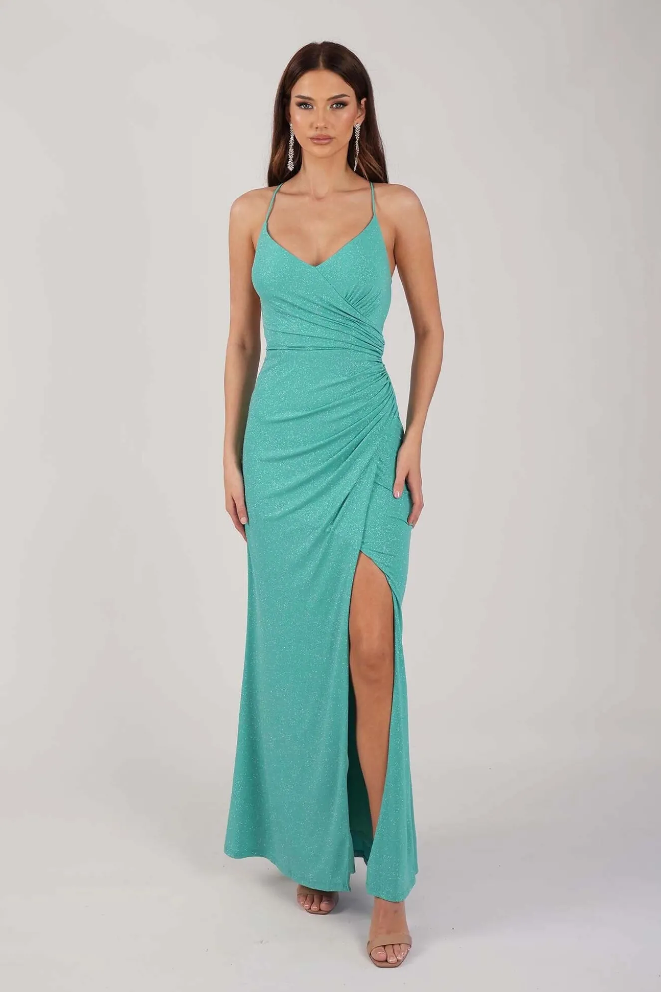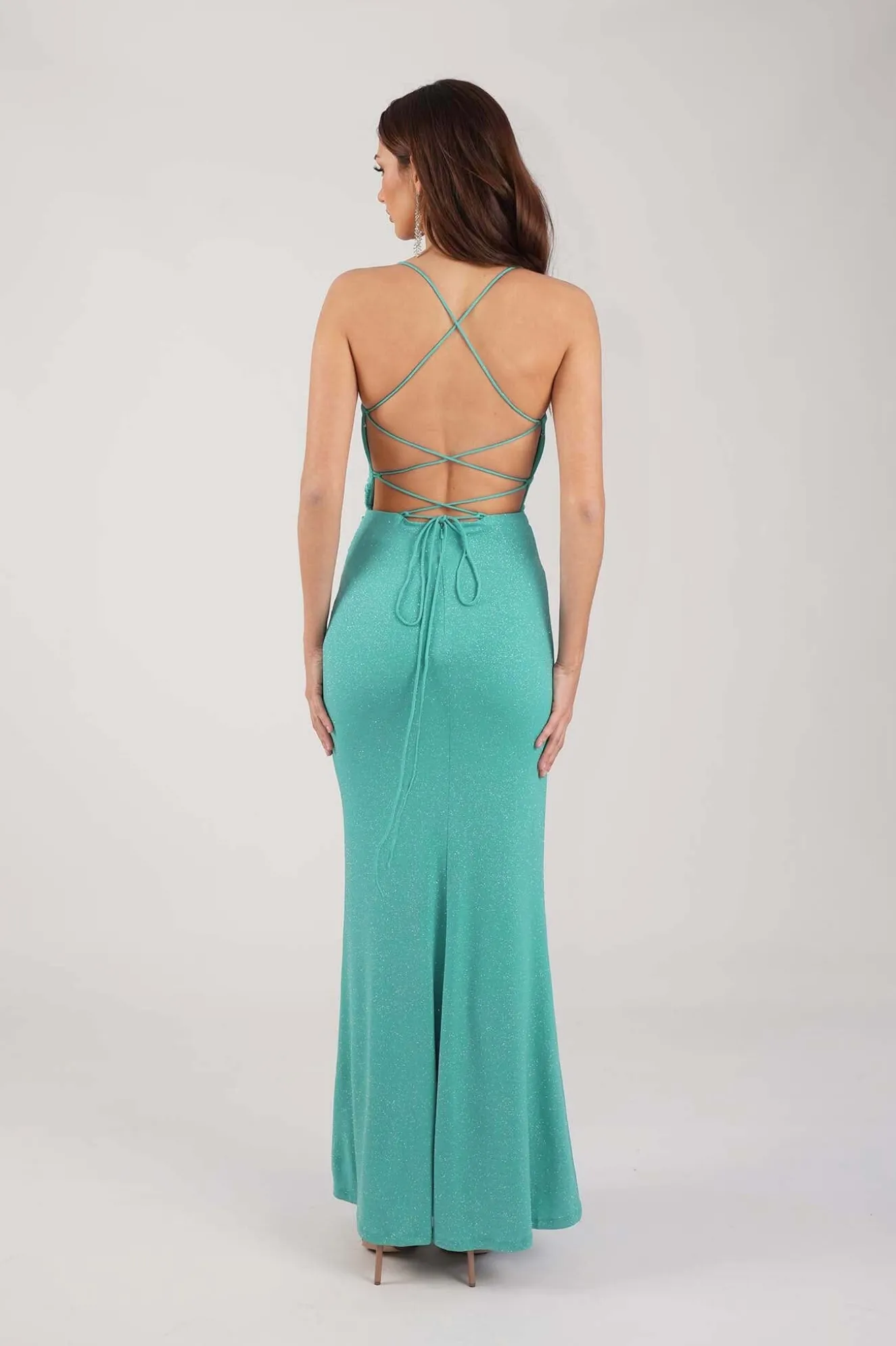 The gorgeous Raya gown features V neckline, backless laced up bodice and side slit. Crafted from stretch shimmer fabric with soft jersey lining, this beautiful evening gown will stun at any formal event such as prom, gala ball and formal wedding.