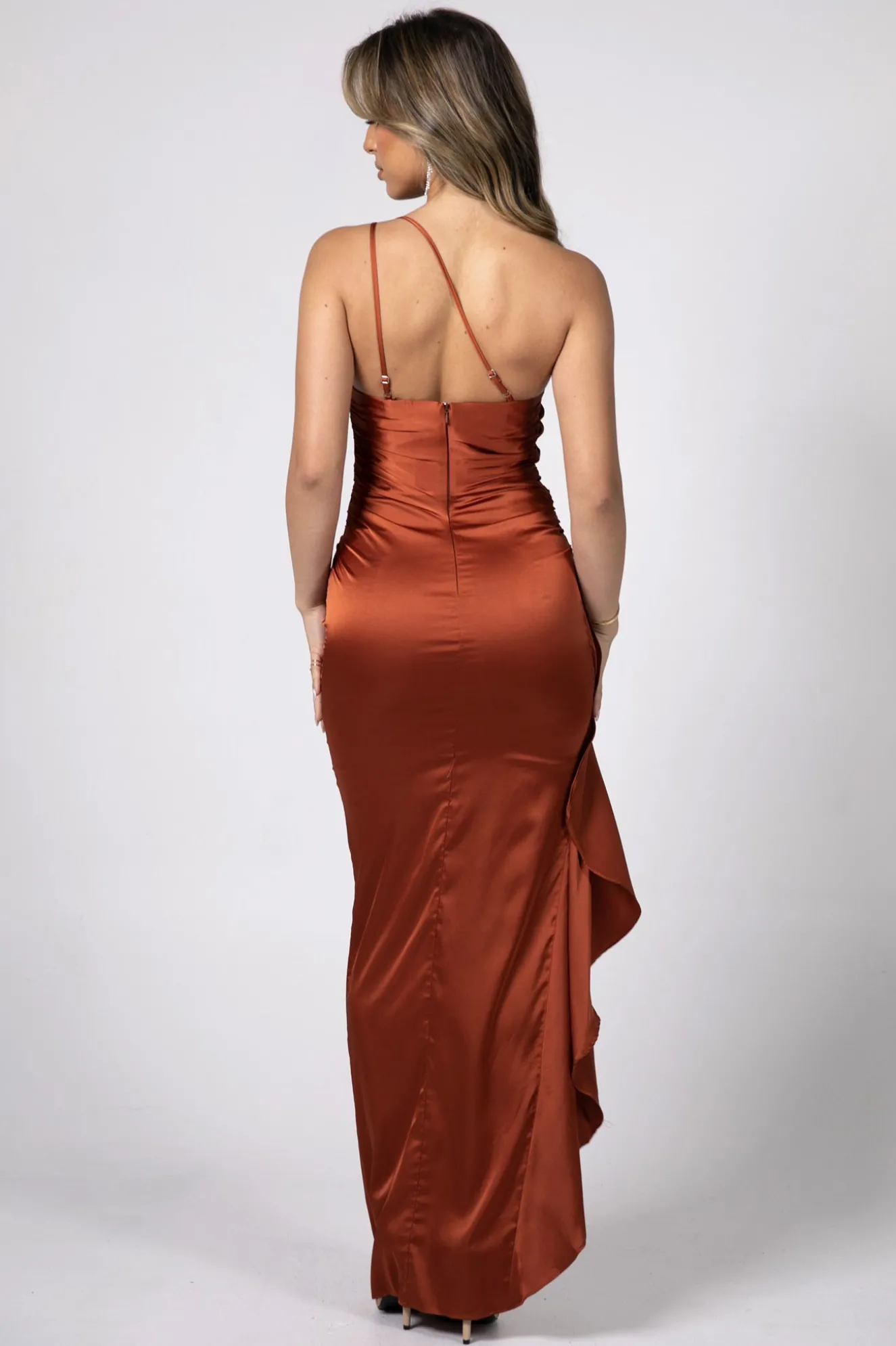 Our Shay evening dress features asymmetrical one shoulder design, gathering detail at waistline and feminine flowy frill hemline. Style this beautiful one shoulder formal dress with drop earrings, high heels and clutch to complete the look.